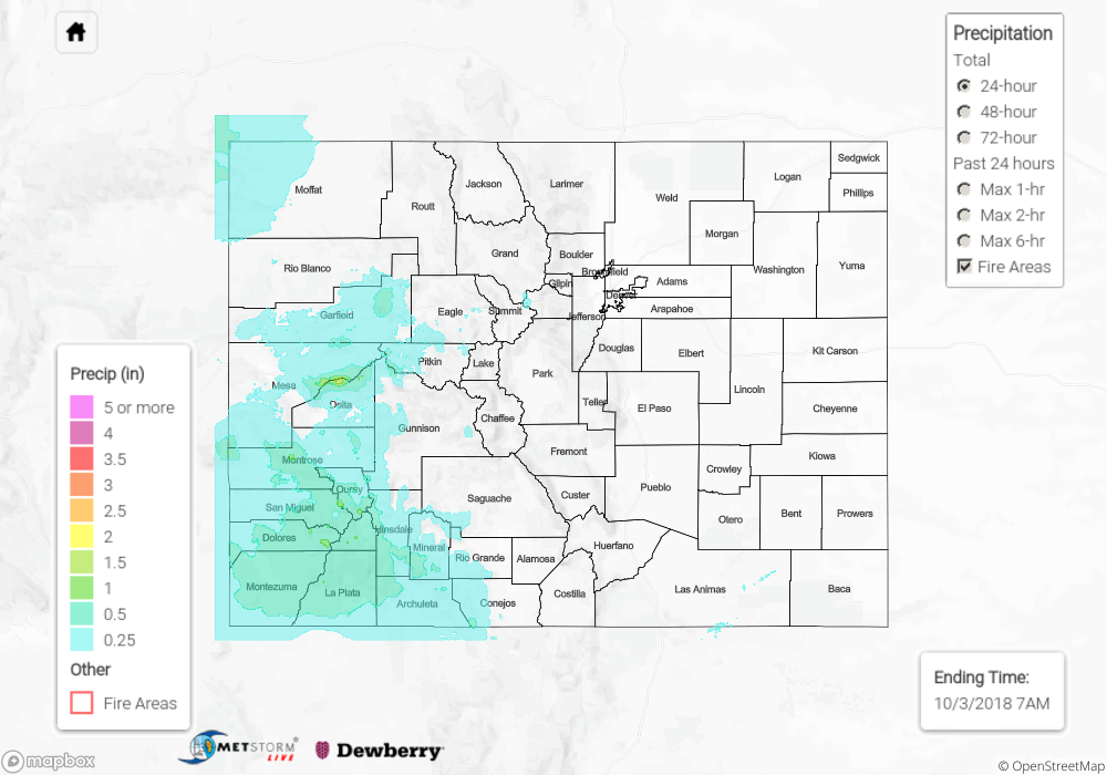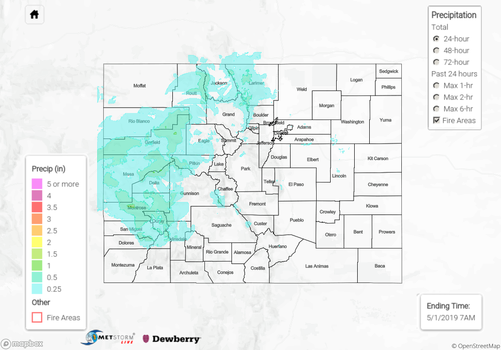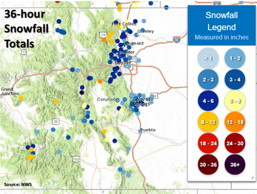 Almost every county across the state received some form of precipitation yesterday. A vorticity max associated with the trough was located over the central portion of the state, and with decent moisture in place, the extra lift was able to produce widespread showers and snowfall. The precipitation fell as snow across the higher elevations with the Front Range and Southeast Mountains receiving 2-8 inches over the last 36 hours. Heavier 24-hour totals were reported over the San Juan and Central Mountains with reports in the 4-10 inch range (see map below). The season of incredible snowfall continues! Tune into the FTO tomorrow for longer and more detailed recap. While the Urban Corridor also saw some snowflakes, most were not able to stick due to ground temperatures above freezing. Overall, temperatures were still a bit below normal. Highs over the Denver Metro area were around 50F, while the eastern plains and western lower elevations reached 60F.