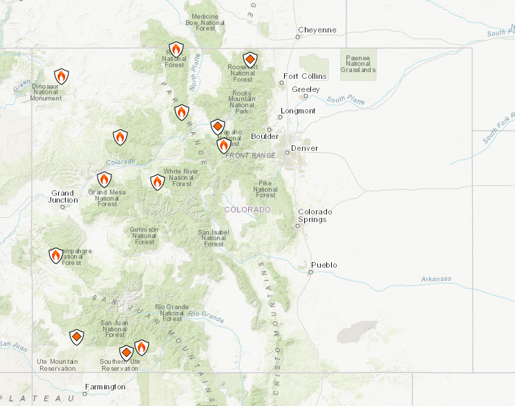 The map below shows radar-estimated, rainfall gage-adjusted Quantitative Precipitation Estimates (QPE) across Colorado. The map is updated daily during the operational season (May 1 – Sep 30) by 11AM. The following six layers are currently available: 24-hour, 48-hour and 72-hour total precipitation, as well as maximum 1-hour, 2-hour and 6-hour precipitation over the past 24 hour period (to estimate where flash flooding may have occurred). The 24-hour, 48-hour and 72-hour total precipitation contain bias corrections that are not disaggregated into the hourly estimates, so there will likely be some differences. The accumulation ending time is 7AM of the date shown in the bottom right corner. Also shown optionally are fire burn areas (post 2012), which are updated throughout the season to include new burn areas. The home button in the top left corner resets the map to the original zoom.