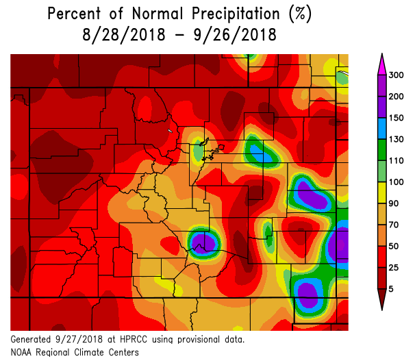 Taking a look back at September precipitation, southeastern Colorado saw near or above average rainfall for the month. Normally, there is a peak in western Colorado rainfall (associated with the monsoon) during September. However, western Colorado continued to see dry conditions, which was highlighted in the increase in area of extreme drought conditions. October is normally a slow rainfall month across the state, but hopefully some beneficial rainfall will occur early next week as moisture from Rosa is advected over western Colorado. The Colorado Flood Threat Bulletin ends on September 30 (Sunday); however, if a flood threat appears, we will be doing special Flood Threat Bulletin(s) as warranted.