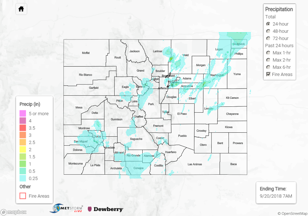 The map below shows radar-estimated, rainfall gage-adjusted Quantitative Precipitation Estimates (QPE) across Colorado. The map is updated daily during the operational season (May 1 – Sep 30) by 11AM. The following six layers are currently available: 24-hour, 48-hour and 72-hour total precipitation, as well as maximum 1-hour, 2-hour and 6-hour precipitation over the past 24 hour period (to estimate where flash flooding may have occurred). The 24-hour, 48-hour and 72-hour total precipitation contain bias corrections that are not disaggregated into the hourly estimates, so there will likely be some differences. The accumulation ending time is 7AM of the date shown in the bottom right corner. Also shown optionally are fire burn areas (post 2012), which are updated throughout the season to include new burn areas. The home button in the top left corner resets the map to the original zoom.