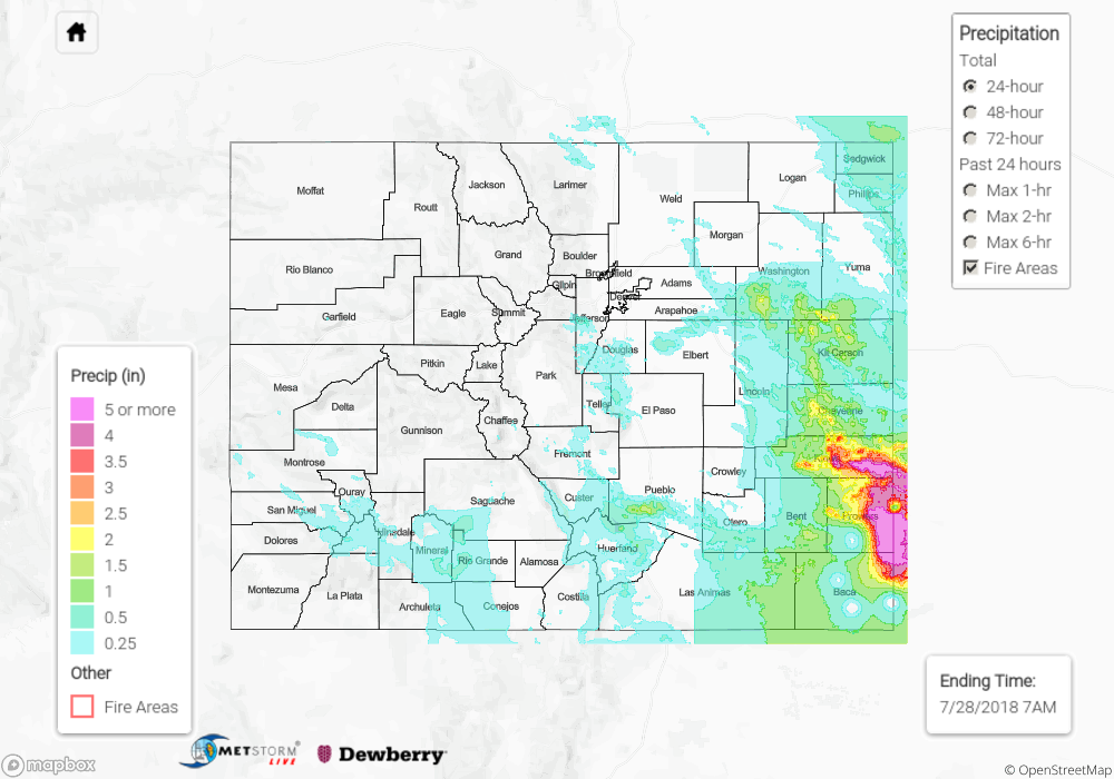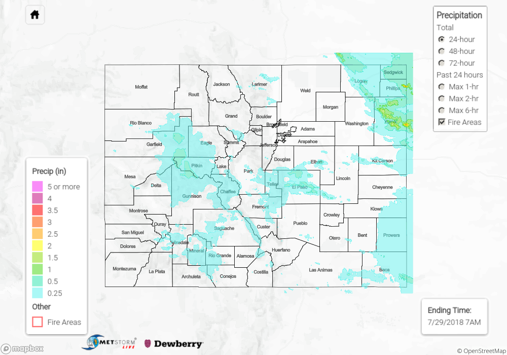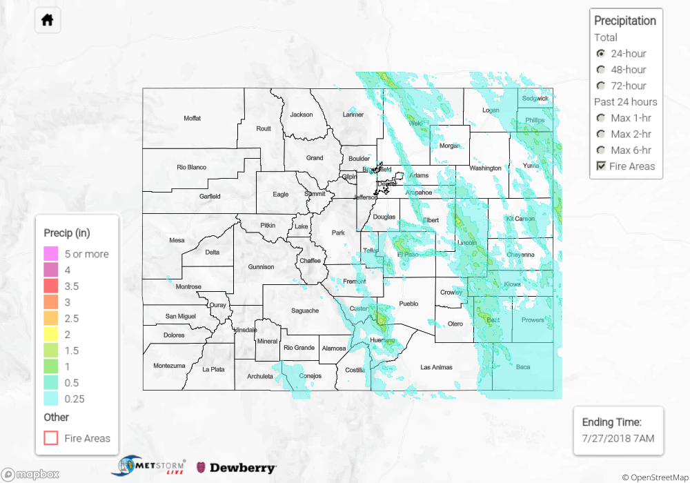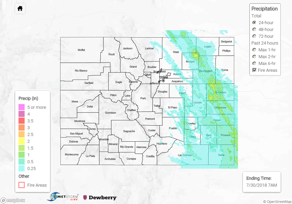 As far as heavy rainfall, 0.7 inches fell in a quick 30-minute span over Pueblo County. The larger storms over the eastern plains were producing 1-hour rain rates just over 2 inches. While rivers in the area rose a couple of feet, no flooding was reported as of Monday morning. The eastern plains have been hammered with heavy rainfall the last few days, so I’m sure they’re looking forward to the break the next couple of days as the dry air works its way in from the north.