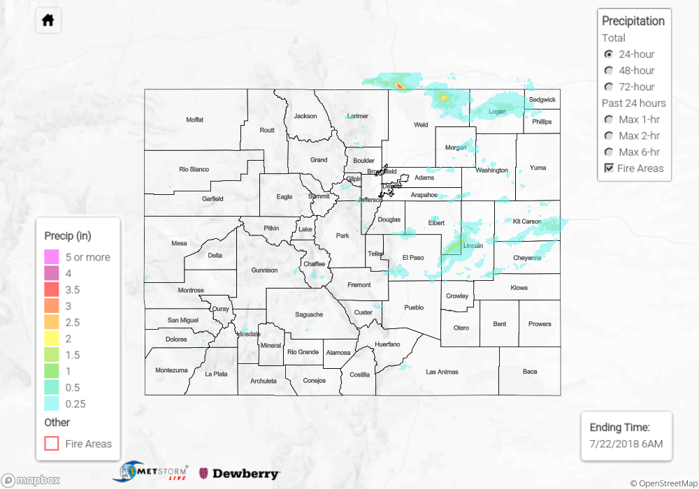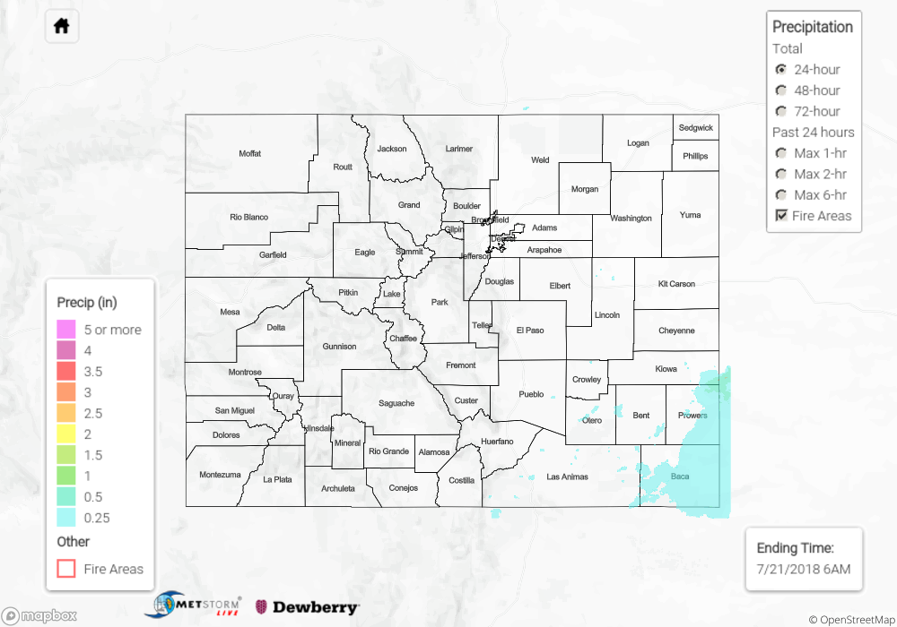 The map below shows radar-estimated, rainfall gage-adjusted Quantitative Precipitation Estimates (QPE) across Colorado. The map is updated daily during the operational season (May 1 – Sep 30) by 11AM. The following six layers are currently available: 24-hour, 48-hour and 72-hour total precipitation, as well as maximum 1-hour, 2-hour and 6-hour precipitation over the past 24 hour period (to estimate where flash flooding may have occurred). The 24-hour, 48-hour and 72-hour total precipitation contain bias corrections that are not disaggregated into the hourly estimates, so there will likely be some differences. The accumulation ending time is 6AM of the date shown in the bottom right corner. Also shown optionally are fire burn areas (post 2012), which are updated throughout the season to include new burn areas. The home button in the top left corner resets the map to the original zoom.