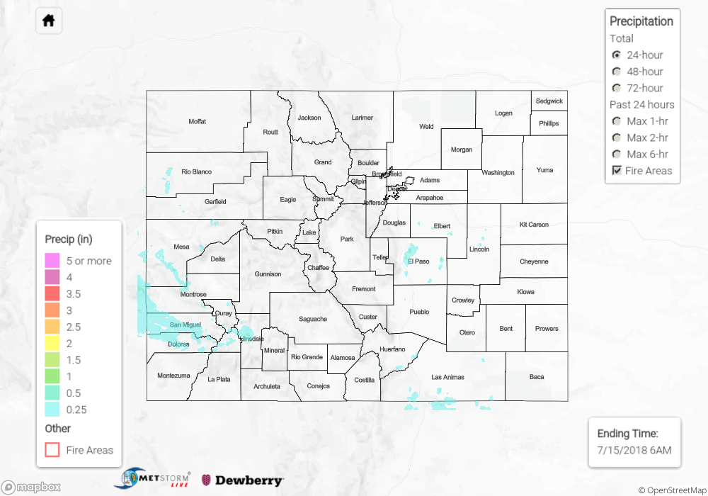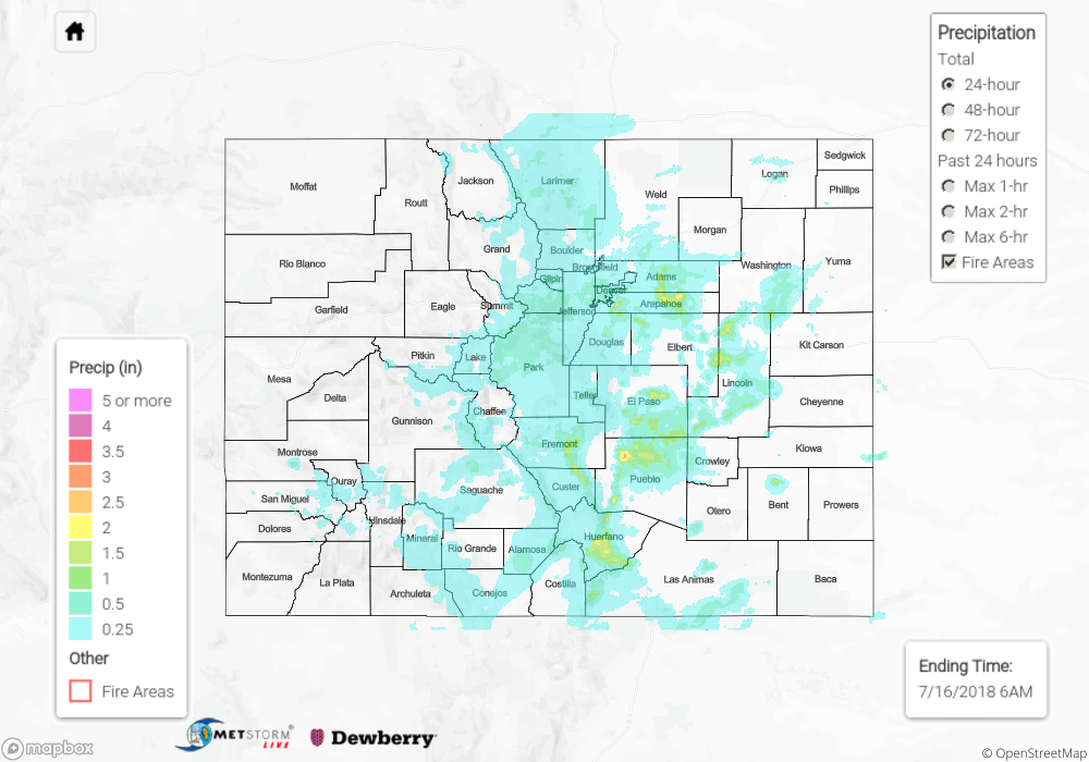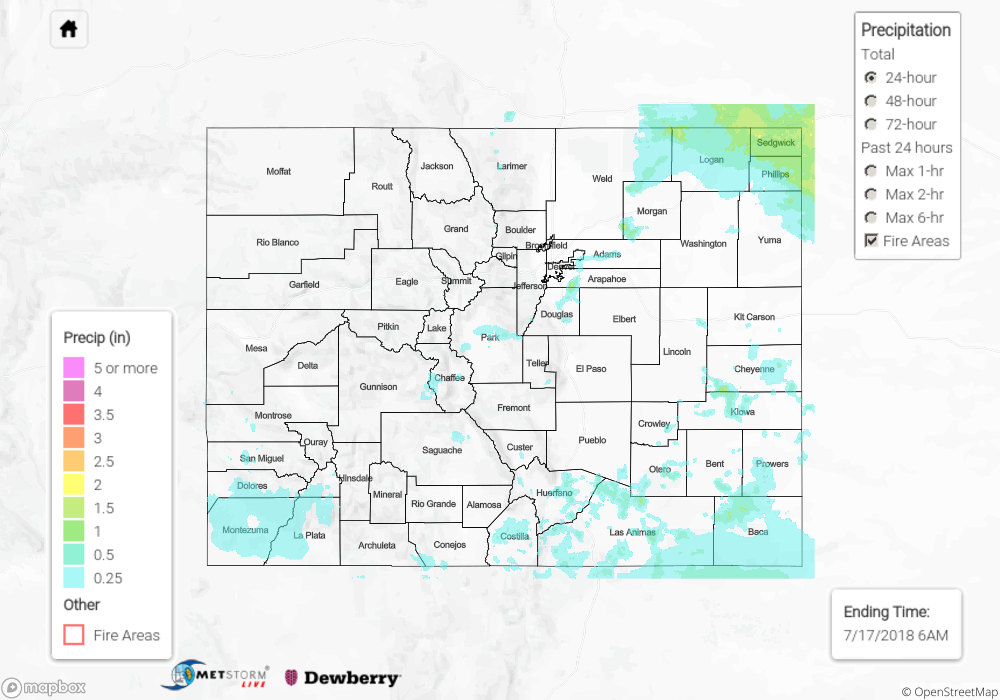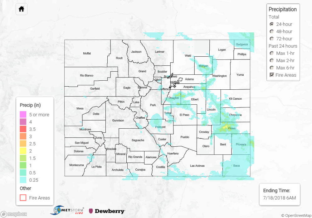 The map below shows radar-estimated, rainfall gage-adjusted Quantitative Precipitation Estimates (QPE) across Colorado. The map is updated daily during the operational season (May 1 – Sep 30) by 11AM. The following six layers are currently available: 24-hour, 48-hour and 72-hour total precipitation, as well as maximum 1-hour, 2-hour and 6-hour precipitation over the past 24 hour period (to estimate where flash flooding may have occurred). The 24-hour, 48-hour and 72-hour total precipitation contain bias corrections that are not disaggregated into the hourly estimates, so there will likely be some differences. The accumulation ending time is 6AM of the date shown in the bottom right corner. Also shown optionally are fire burn areas (post 2012), which are updated throughout the season to include new burn areas. The home button in the top left corner resets the map to the original zoom.