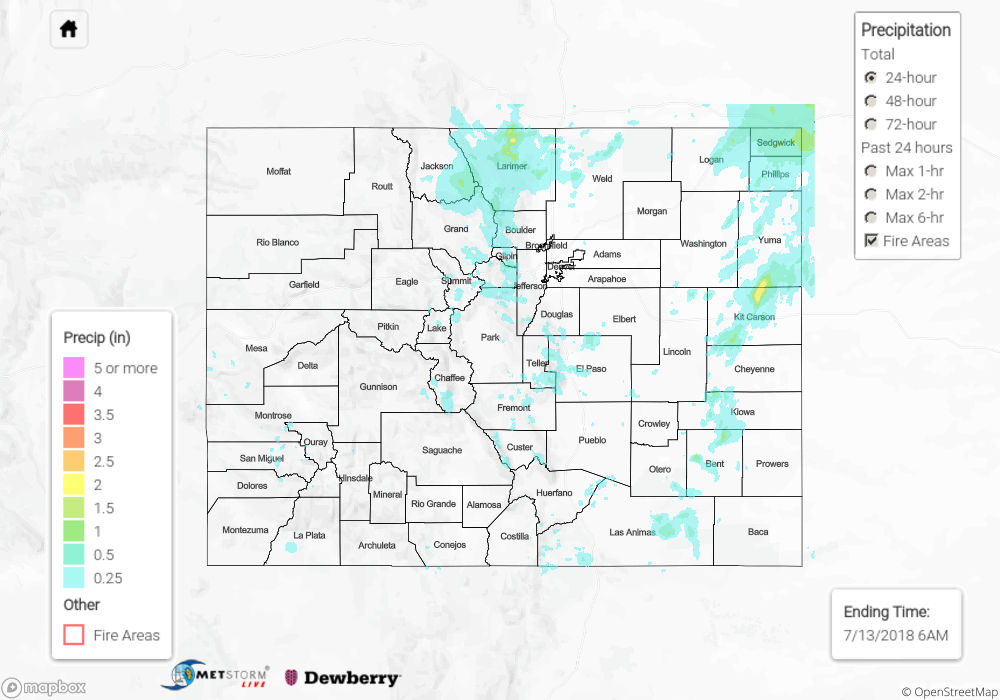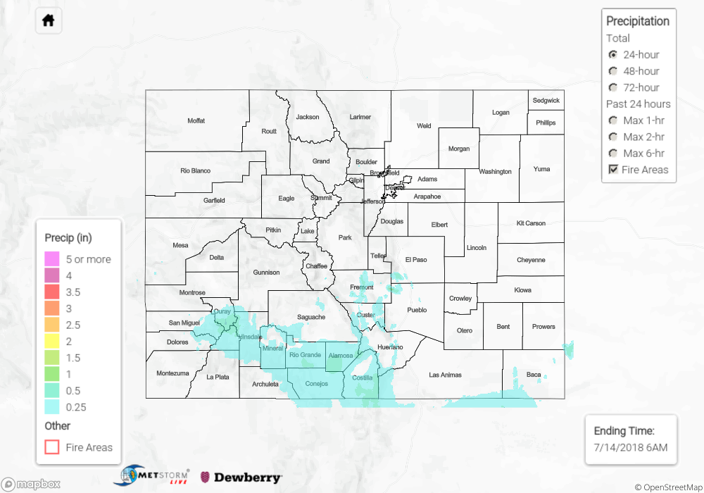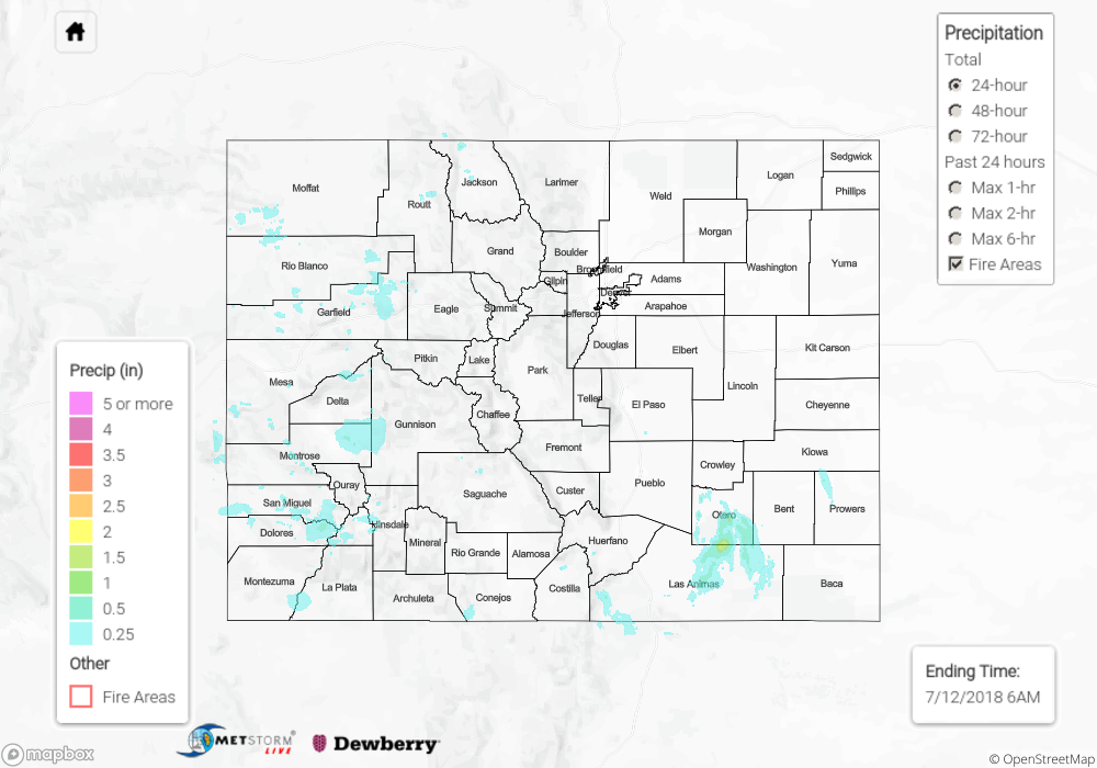 The map below shows radar-estimated, rainfall gage-adjusted Quantitative Precipitation Estimates (QPE) across Colorado. The map is updated daily during the operational season (May 1 – Sep 30) by 11AM. The following six layers are currently available: 24-hour, 48-hour and 72-hour total precipitation, as well as maximum 1-hour, 2-hour and 6-hour precipitation over the past 24 hour period (to estimate where flash flooding may have occurred). The 24-hour, 48-hour and 72-hour total precipitation contain bias corrections that are not disaggregated into the hourly estimates, so there will likely be some differences. The accumulation ending time is 6AM of the date shown in the bottom right corner. Also shown optionally are fire burn areas (post 2012), which are updated throughout the season to include new burn areas. The home button in the top left corner resets the map to the original zoom.