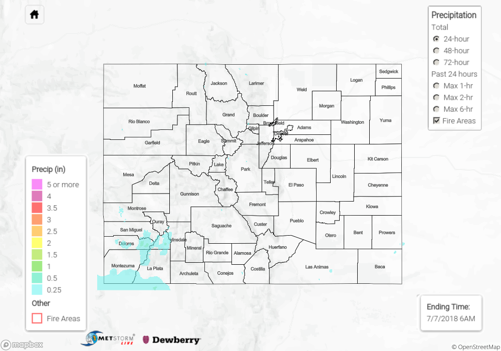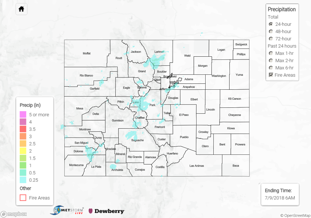 With the high pressure over the Nebraska panhandle and the ridge’s slow movement to the east, another day of clockwise rotation occurred in Colorado’s upper atmosphere. This pulled in some very dry air from the east at the low-levels and pushed the main subtropical moisture over western Colorado further west into Utah and Arizona. Between these two factors, the intensity and coverage of the storms yesterday were reduced. Over eastern Colorado, general subsidence and the entrainment of dry air allowed only for a few light showers over the higher terrains. The southwest corner of the state was the most active on Monday with thunderstorms kicking off over the San Juan Mountains by 3PM. CoCoRaHS in the area just south of the San Juan Mountains recorded up to 0.3 inches of rain. Near the two main burn areas, ASOS stations recorded just over 0.10 inches with the Scotch Creek SNOTEL receiving 0.5 inches. Luckily, none of the higher rain rate producing storms tracked directly over the burn areas. More isolated showers and thunderstorms occurred over the Central Mountains, Grand Valley and northwest corner of the state. Radar rainfall estimates were under 0.1 inches. All thunderstorm and shower activity ended by 11PM.
