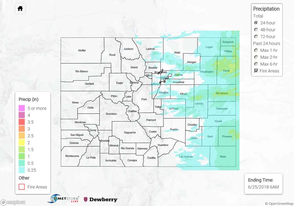 The map below shows radar-estimated, rainfall gage-adjusted Quantitative Precipitation Estimates (QPE) across Colorado. The map is updated daily during the operational season (May 1 – Sep 30) by 11AM. The following six layers are currently available: 24-hour, 48-hour and 72-hour total precipitation, as well as maximum 1-hour, 2-hour and 6-hour precipitation over the past 24 hour period (to estimate where flash flooding may have occurred). The 24-hour, 48-hour and 72-hour total precipitation contain bias corrections that are not disaggregated into the hourly estimates, so there will likely be some differences. The accumulation ending time is 6AM of the date shown in the bottom right corner. Also shown optionally are fire burn areas (post 2012), which are updated throughout the season to include new burn areas. The home button in the top left corner resets the map to the original zoom.