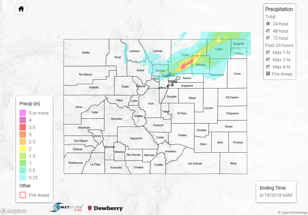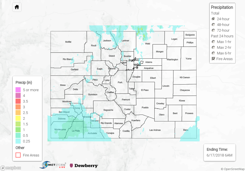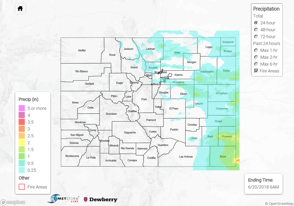 The map below shows radar-estimated, rainfall gage-adjusted Quantitative Precipitation Estimates (QPE) across Colorado. The map is updated daily during the operational season (May 1 – Sep 30) by 11AM. The following six layers are currently available: 24-hour, 48-hour and 72-hour total precipitation, as well as maximum 1-hour, 2-hour and 6-hour precipitation over the past 24 hour period (to estimate where flash flooding may have occurred). The 24-hour, 48-hour and 72-hour total precipitation contain bias corrections that are not disaggregated into the hourly estimates, so there will likely be some differences. The accumulation ending time is 6AM of the date shown in the bottom right corner. Also shown optionally are fire burn areas (post 2012), which are updated throughout the season to include new burn areas. The home button in the top left corner resets the map to the original zoom.