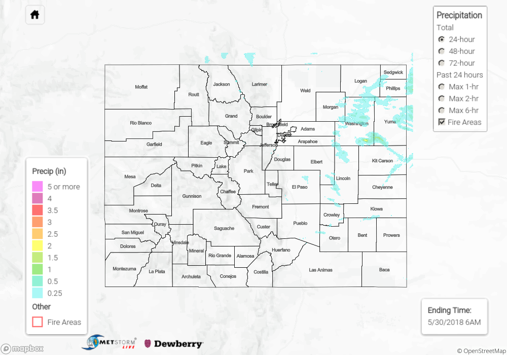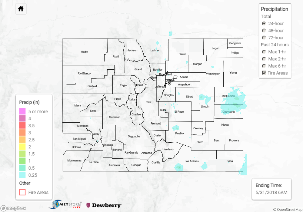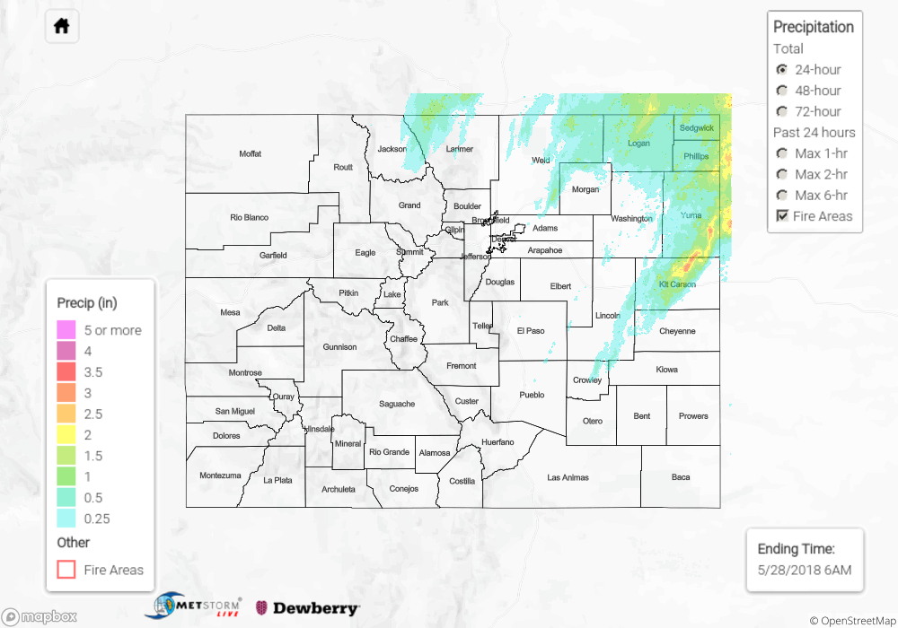East of the Continental Divide, and especially for the lower elevations east of the mountains, low-level moisture was sufficient to provide the fuel for more numerous, stronger thunderstorms. The peak of thunderstorm activity was from the late afternoon through sunset, and storms quickly diminished between sunset and midnight. Periods of moderate-to-heavy rainfall attended the stronger storms; 1 inch/40 minutes was reported 7 miles SW of Calhan in El Paso County.