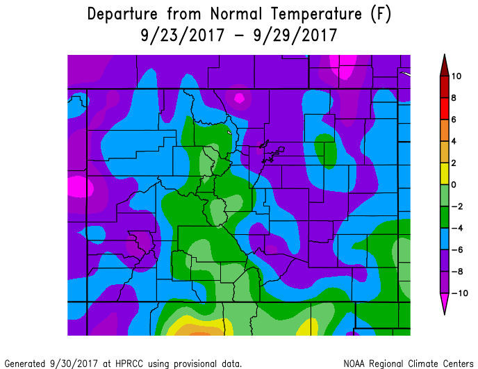 Scattered-to-widespread showers and thunderstorms impacted the state yesterday, and continue to do so this morning, thanks to the presence of an upper-level disturbance and plenty of moisture being pulled in from the Pacific. Most everywhere in the state got in on the action except for the far Southeast Plains, which hung on to the drier conditions and mustered only an isolated light shower or two. The high country received periods of heavy snow, generally above 9,000 feet, with 6-10 inches (or more) reported in some locations. As temperatures cooled overnight, snow levels dropped to as low as 7,000 feet this morning, bringing some accumulating snow to locations in the foothills and higher elevations of the Palmer Ridge.