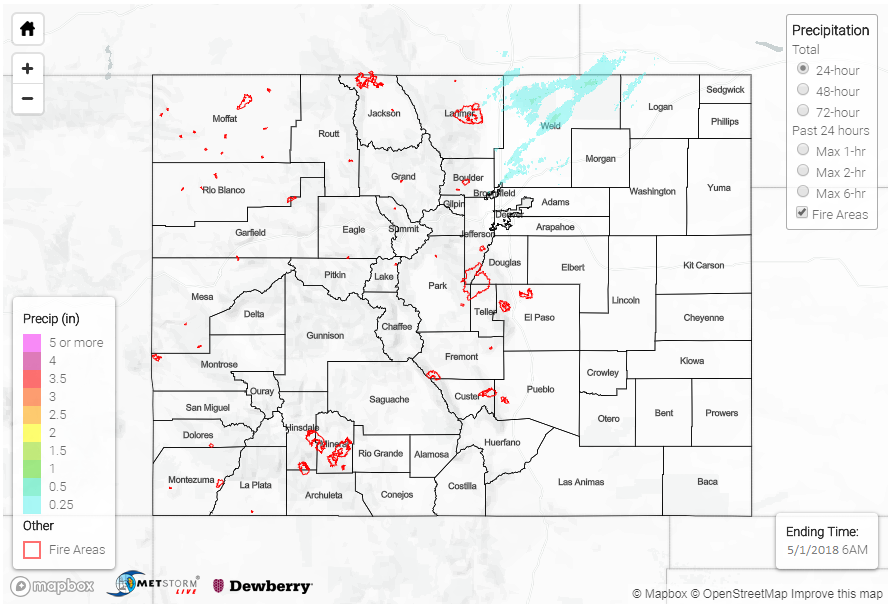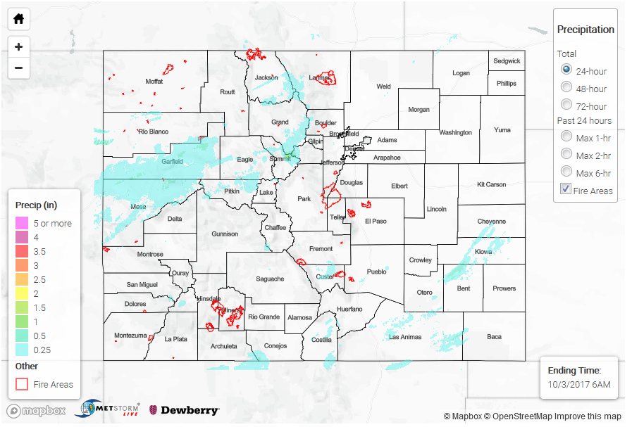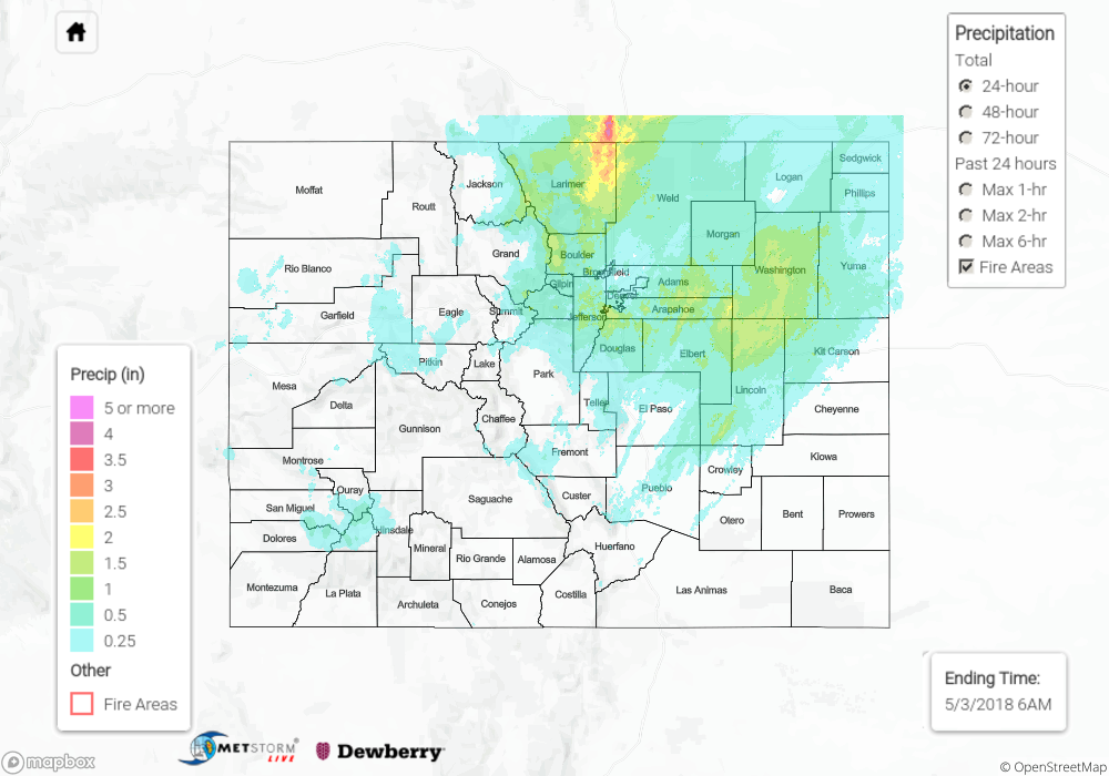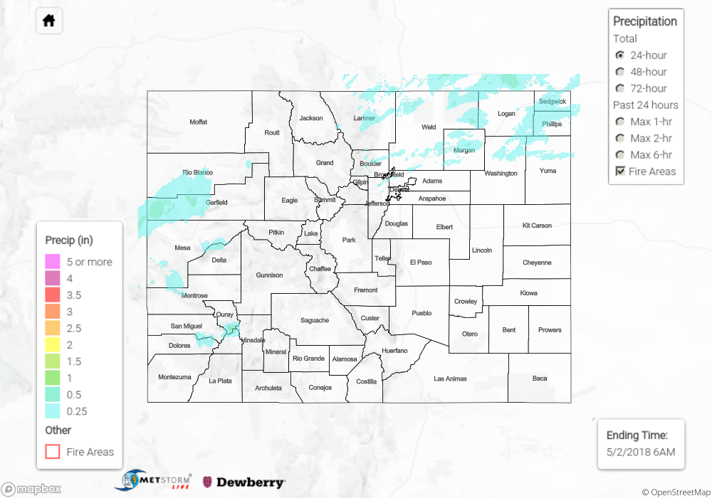 For elevations below 9,000 feet (sans this morning’s transition to snow between 7,000-9,000 feet), rainfall was generally light-to-moderate, with pockets of heavier rain mixed in across the Northeast Plains, Palmer Ridge, and Urban Corridor regions. Small hail accompanied a few thunderstorms, with the largest hail of the day (0.88 inches in diameter) reported 6 miles W of Punkin Center (Lincoln County).
