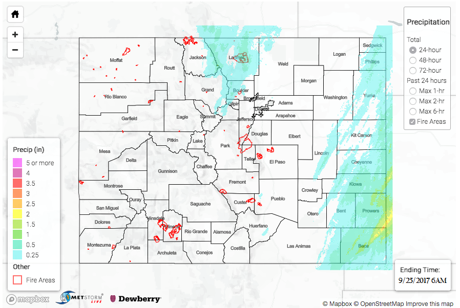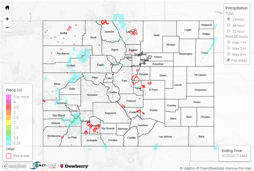 Over the Northern Mountains and Northern Front Range, freezing levels had dropped quite a bit, so the higher elevations saw more snow that rain. A few SNOTEL stations reported totals up to 0.6 inches in the central, northern high terrains. Along the northern Front Range, totals were a bit higher. West of Fort Collins in the foothills, just under 1 inch of rain fell with totals in and around 0.5 inches for the cities of Fort Collins and Loveland.