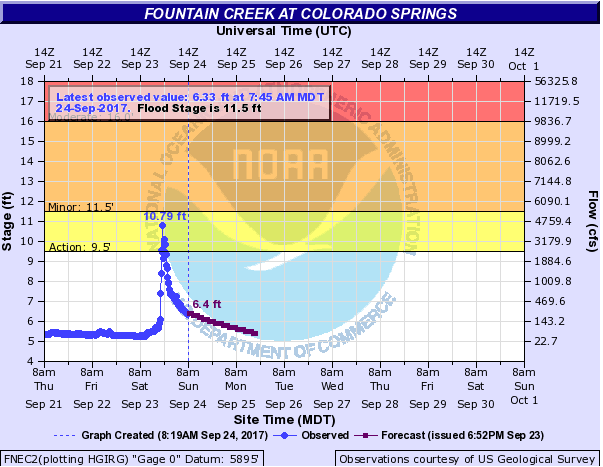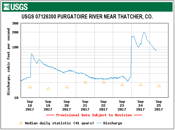 The Pueblo radar was back up and working Sunday morning, so estimates yesterday were much more accurate than Saturday. Over the southeast corner of the state, a few rounds of precipitation yesterday and last night added up making some impressive 48-hour totals. Over the last 48-hour period, radar estimates over the eastern plains have been around 5 inches (close to a 1 in 25 year event). An Areal Flood Advisory was issued late last night for Prowers and Baca Counties as a line of thunderstorms moved over an area that had already seen 1.5 inches of rain earlier in the day. Yesterday alone, portions of Baca and Prowers Counties recorded 3-3.5 inches of rain. Fortunately, no flooding has been reported, which includes riverine flooding in and around the Arkansas River. Most stations (as seen below) are showing two distinct peaks from the rainfall on Saturday and Sunday. High running rivers, creeks and arroyos will start to recover as the system begins moving further east and the Southeast Plains dry out.