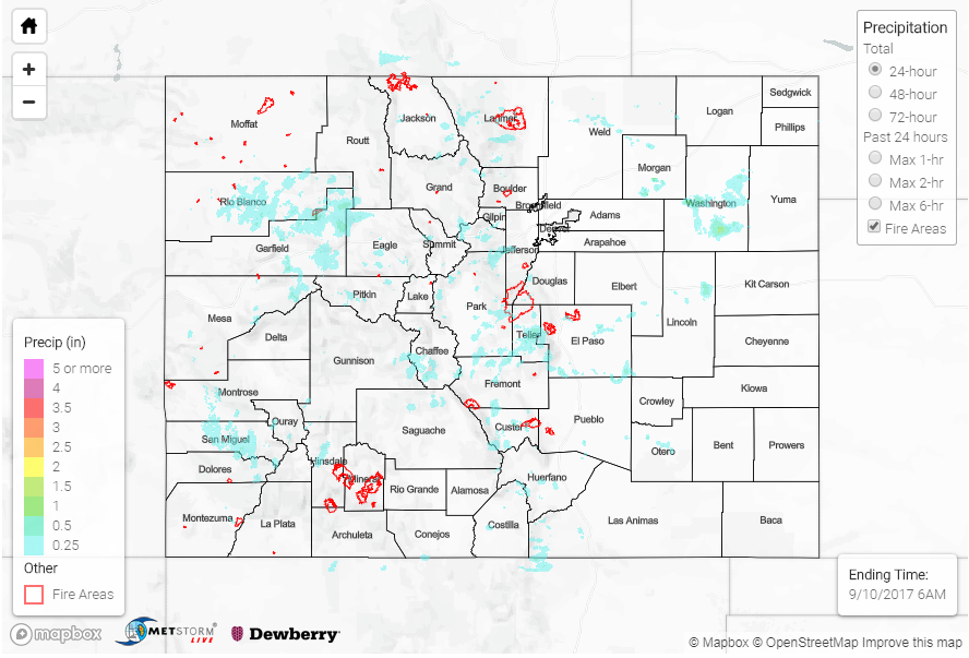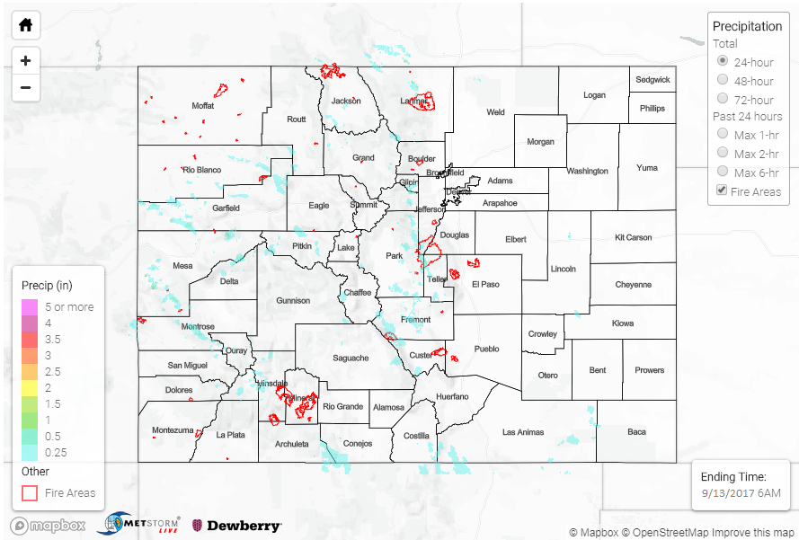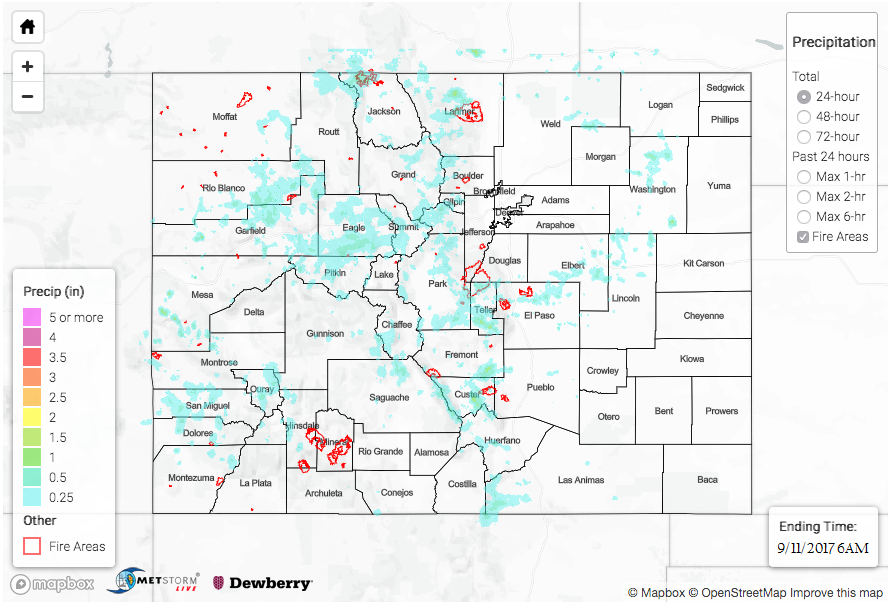 Over the western mountains, up north, rain observations were as high as 0.38 inches. Radar estimates were around 0.5 inches. Further south, the totals decreased and most observations were in the 0.15 to 0.25 range although radar rainfall estimates in Conejos County were 0.5 inches. Along the Southeast Mountains, a SNOTEL station north of Fort Garland recorded 0.4 inches in the evening. This same storm prompted an Areal Flood Advisory over the Hayden Pass Burn Scar, but no flooding was reported. Radar estimates over this area were up to 0.5 inches. It should be noted that the Pueblo NWS radar is down for maintenance through the end of September, so radar rainfall estimates in this region will be affected.