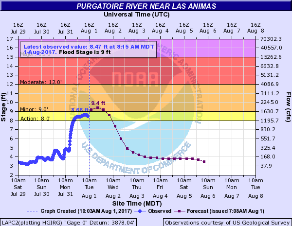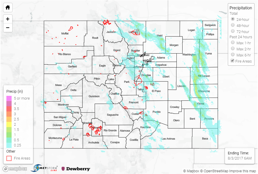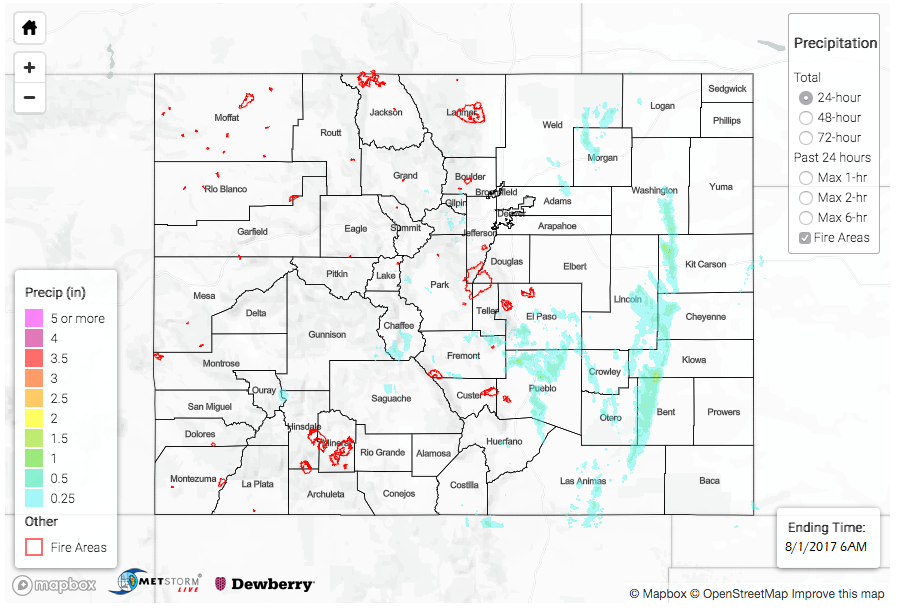 Both the thunderstorms over Elbert County and the Southeast Mountains had areal flood advisories issued for heavy rainfall. Over the plains, 1-hour rainfall was as high as 1.5 inches. Storm total rainfall was estimated at 2.8 inches. In the high country, most CoCoRaHS and SNOTEL stations recorded about 0.5 inches of rainfall for the 24-hour period. However, rainfall estimates were as high as 1.5 inches. A Flash Flood Warning was issued for the Hayden burn scar. Flash flooding occurred in the area of Dinkle Ditch, and Dinkle Ditch Road was washed out. There was high water reported in all the nearby creeks due to the runoff from the burn scar. An aerial flood advisory was issued for the Junkins burn scar as well, but, fortunately, there were no flooding reports as of this morning over that area.