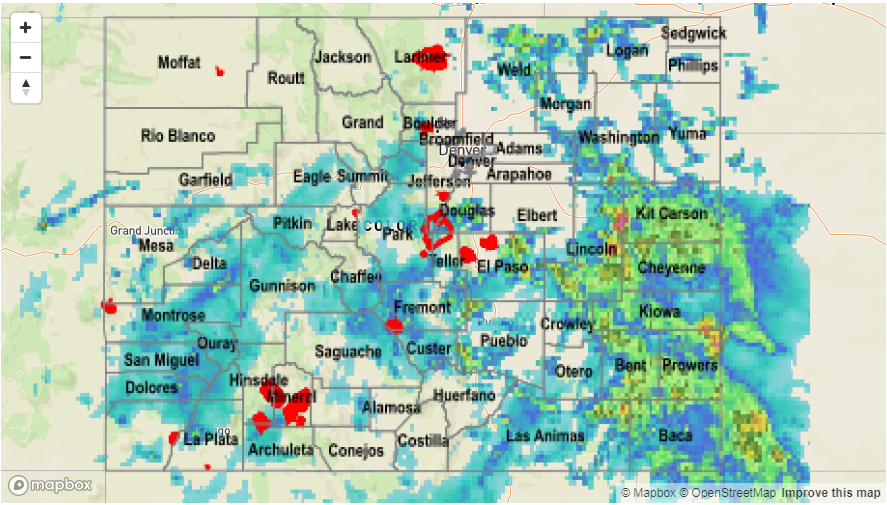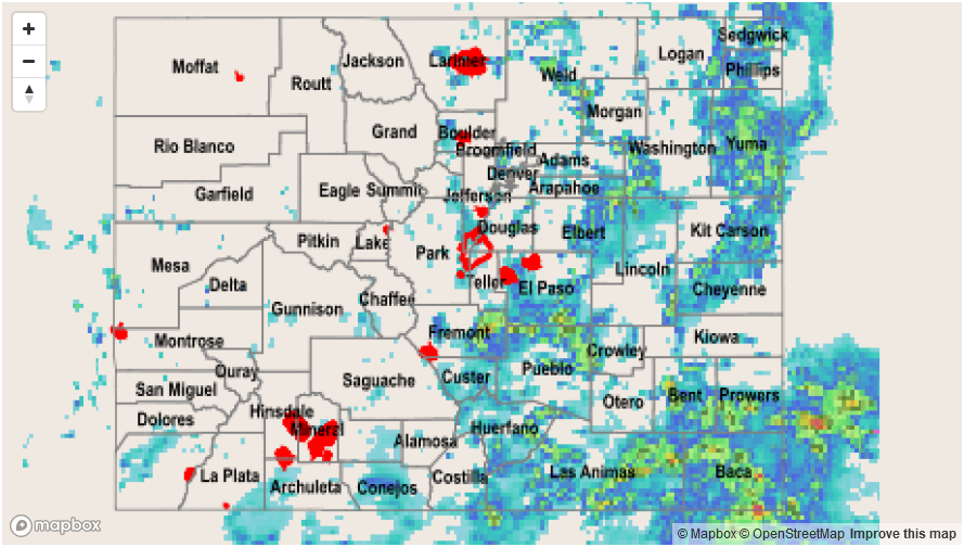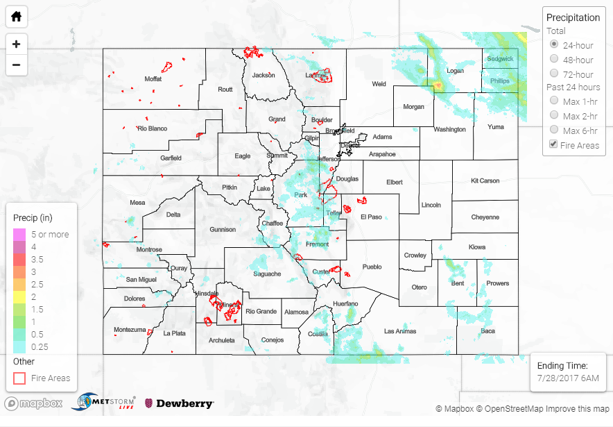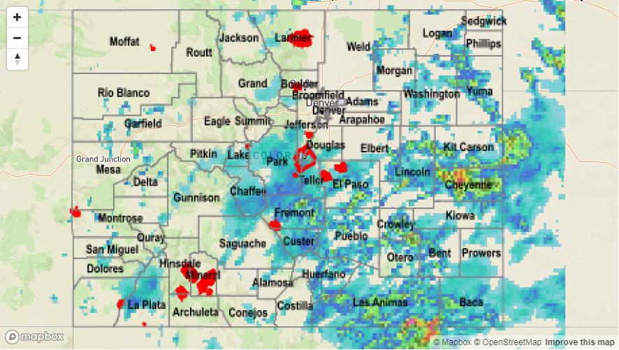 Over the San Juan Mountains, CoCoRaHS stations recorded around 0.5 inches. Radar estimates for this area were 1.1 inches. Over the Southeast Mountains, a CoCoRaHS station in Huerfano County (Walsenburg) recorded 2.33 inches. 2.28 inches of that total fell in 45 minutes. A bit further north, a gage in Fremont County recorded 0.75 inches in 20 minutes over Canon City. A gage in Manitou Springs also recorded 0.75 inches in 20 minutes. This same gage in Manitou Springs reported a storm total 1.3 inches (all of which fell in about 1 hour). Fountain Creek was running near action level again, with 1.96 inches reported falling at Fort Carson, but no major flooding of the river was reported. The river is expected to recover throughout the day. Storm totals in this area were estimated as high as 4 inches. There was another storm over Pueblo that dropped 2.2 inches of rain and there were several reports of flooded roads in town.