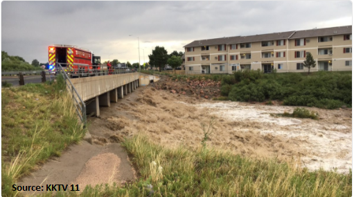 Both Colorado Springs and Pueblo had areal flooding advisories and flash flooding. Over Colorado Springs, rainfall totals of 2.37 inches were reported. There was even a report of 2.94 inches in just over 30 minutes in this same area southwest of Colorado Springs. This was located in the storm core, but there isn’t a sure way to verify this amount. Nonetheless, it shows the intensity of the rainfall. Radar estimates were 1.5 inches per hour with 3-hour totals of 2.5 inches. Total rainfall over Pueblo was estimated at 1.5 inches. Over Colorado Springs, total rainfall was estimated at 2.5 with the highest recorded precipitation value of 1.18 inches at a CoCoRaHS station near the airport. Gusts up to 41 mph were also recorded. A photo from Sand Creek in Colorado Springs from KKTV 11 News is below.
