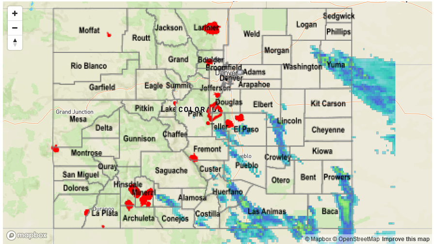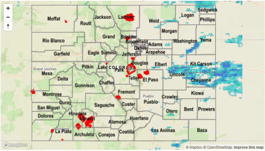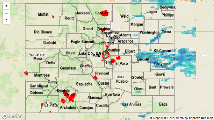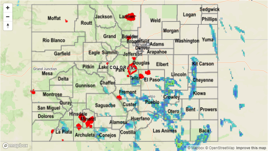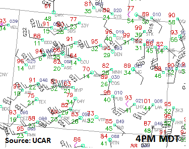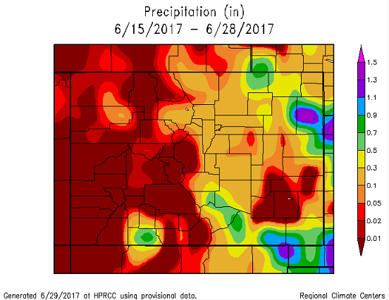 The persistent pattern of weather the last two weeks can be very well seen in a cumulative precipitation map. East of the Continental Divide, there has been little moisture, and therefore almost no rainfall. West of the Divide, isolated showers have developed over the higher terrain almost every afternoon. Coupled with higher moisture, these storms have brought consistent rainfall to the Northeast and Southeast Plains.