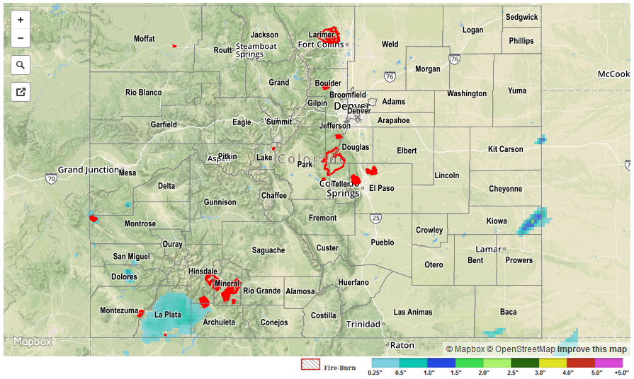 The subtropical moisture surge from the south continued across western Colorado, providing another period of scattered showers/isolated thunderstorms. Scattered showers continue this morning across the High Country, mainly north of I-70, with a few beginning to spill over adjacent portions of the Urban Corridor. Most precipitation at this time is falling as rain, with snow above approximately 10,000 feet. Overall, showers/thunderstorms produced light-to-moderate rainfall, with a few extended periods leading to rainfall totals greater than 0.30 inches. Below is the list of rainfall “winners,” according to CoCoRaHS observer reports as of 7:30 AM MDT: