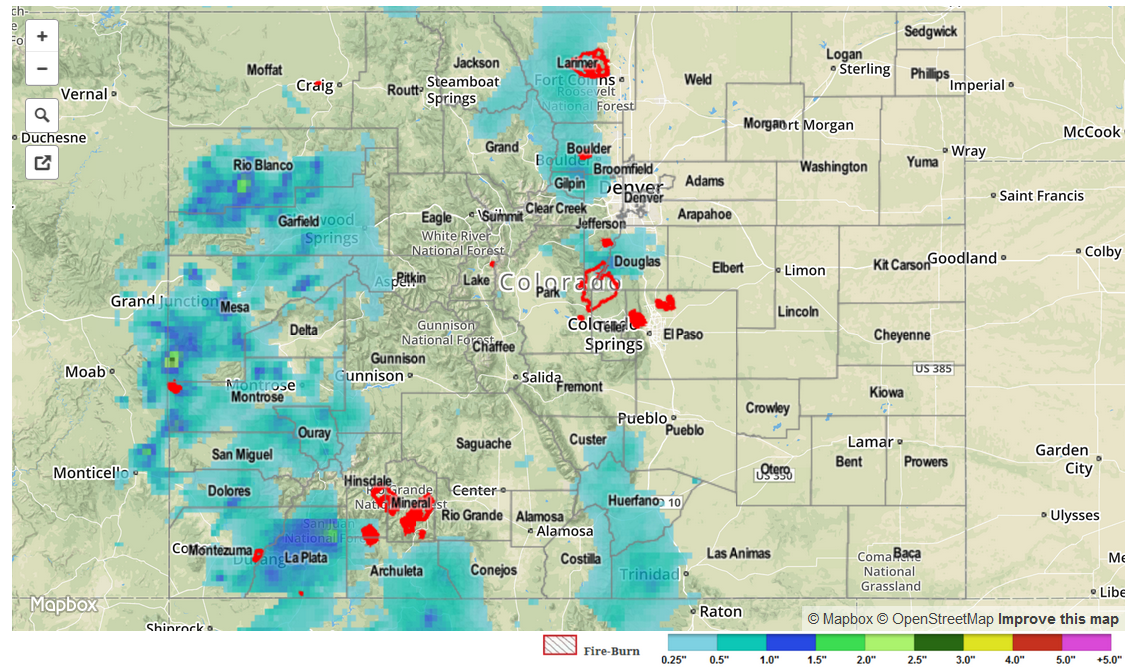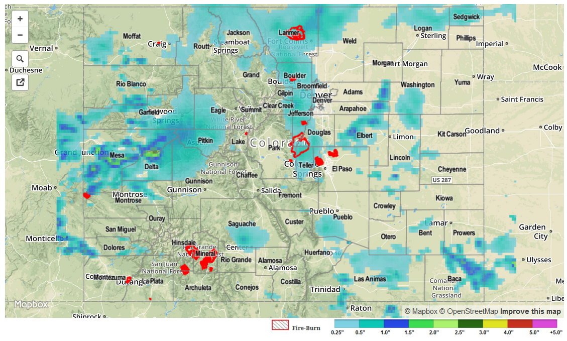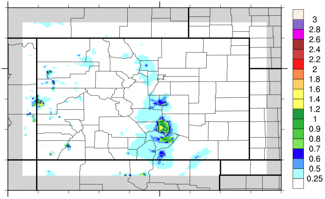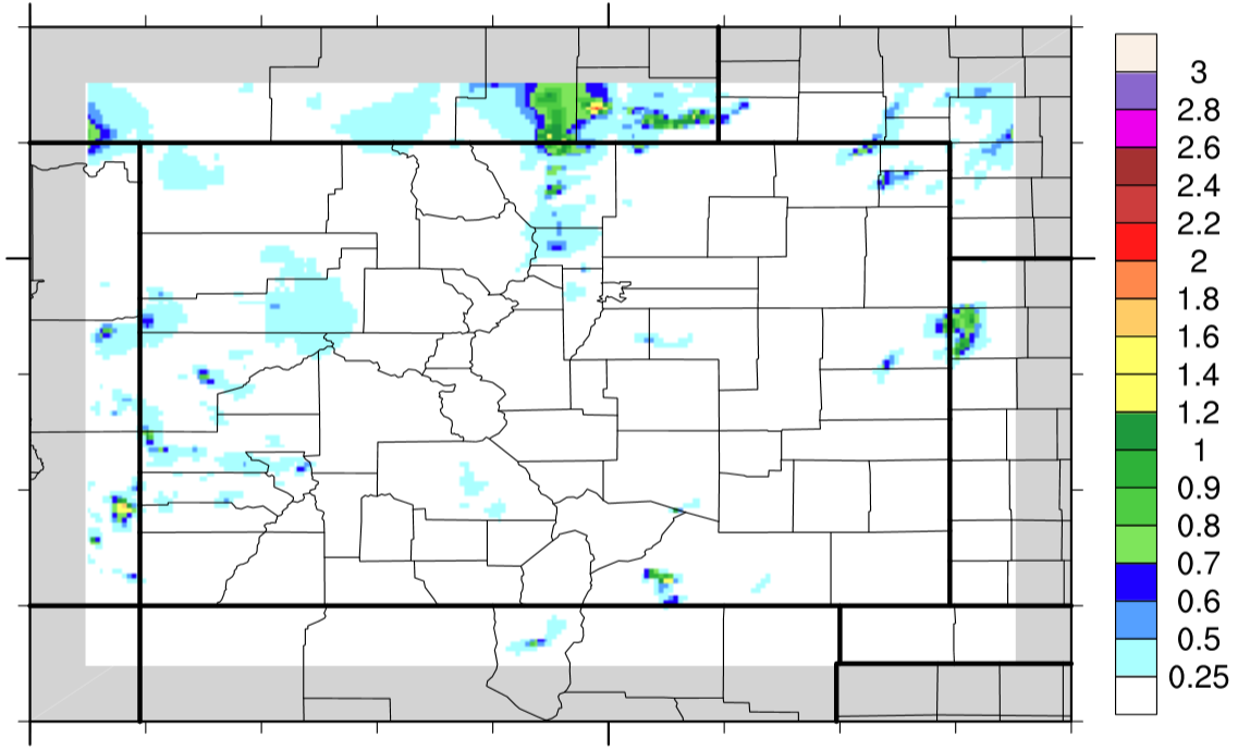 Storms did not wait long to develop on Wednesday with activity beginning before noon west of the Divide and around noon to the east. As with the past few days, individual storms only lasted about 30 minutes or so, which helped to limit rainfall in any one area. The highest observed 24-hr total was 1.32 inches in Clear Creek County. About a dozen official reports over 1 inch were received from Elbert, Boulder, Jefferson and Larimer counties. Meanwhile, quite a few areas, both east and west of the Divide, received from 0.75 to 1 inch.