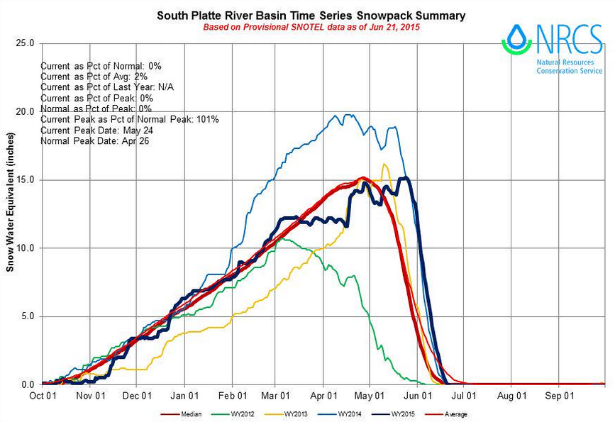 Otherwise, snow melt is nearly complete statewide and all mountain-sourced streams are beginning to subside. The Arkansas River was still in minor flood stage, but on its way down.