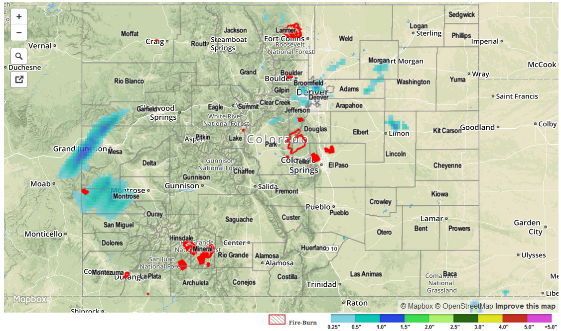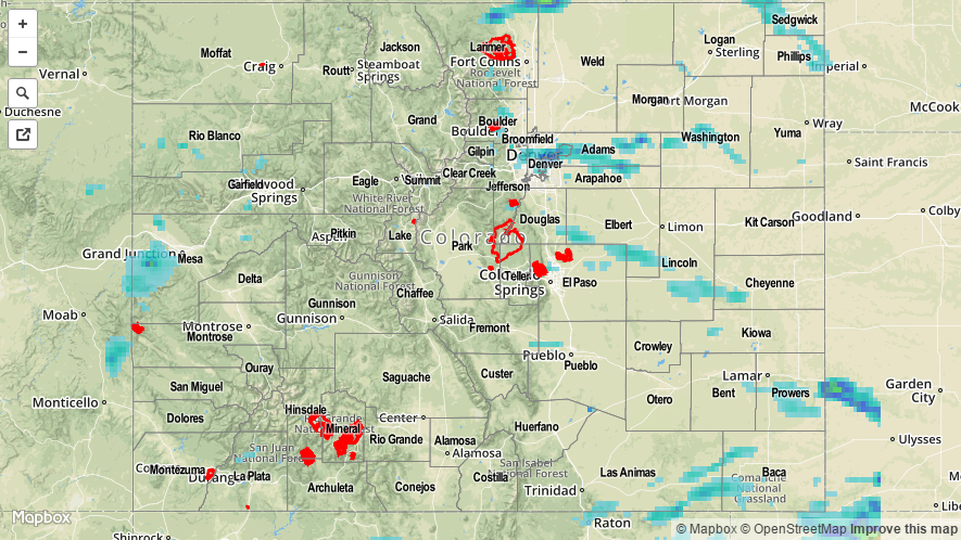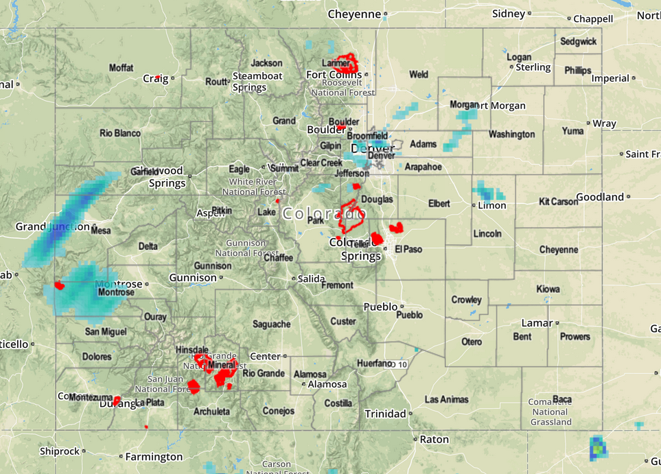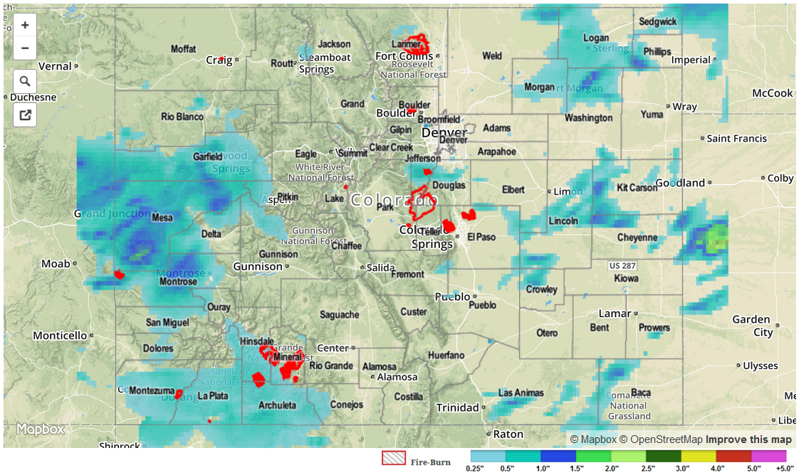 A disturbance slowly moving across the state coordinated multiple rounds of storm activity across most of Colorado. Over the southern half of the state, storms had to battle very dry air aloft to survive, which likely reduced rainfall rates. Twenty-four hour rain totals amounted to over an inch in Douglas, Mesa and La Plata counties as well as isolated areas in far eastern Colorado. Meanwhile, the highest hourly rain rates may have occurred with a batch of storms moving eastward off the higher terrain and into the Urban Corridor between 3 and 5 PM. One such storm passed over the sensor-rich Urban Drainage ALERT network, dumping about 0.9 inches of rain in less than an hour at two separate gauges.
