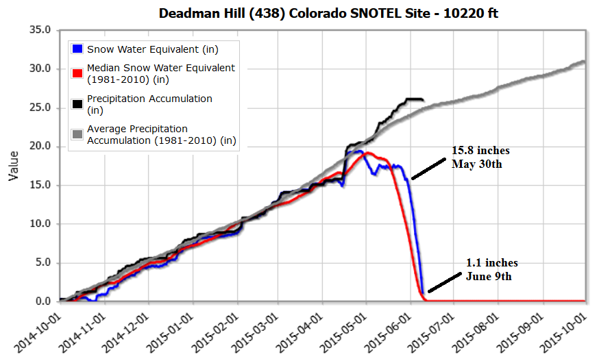 Meanwhile, the rapid snowmelt continued in the higher terrain. Elevations below 10,000 feet are essentially snow-free with the remaining snowpack retreating towards wooded, very high-elevation regions between 10,000 feet and the treeline.