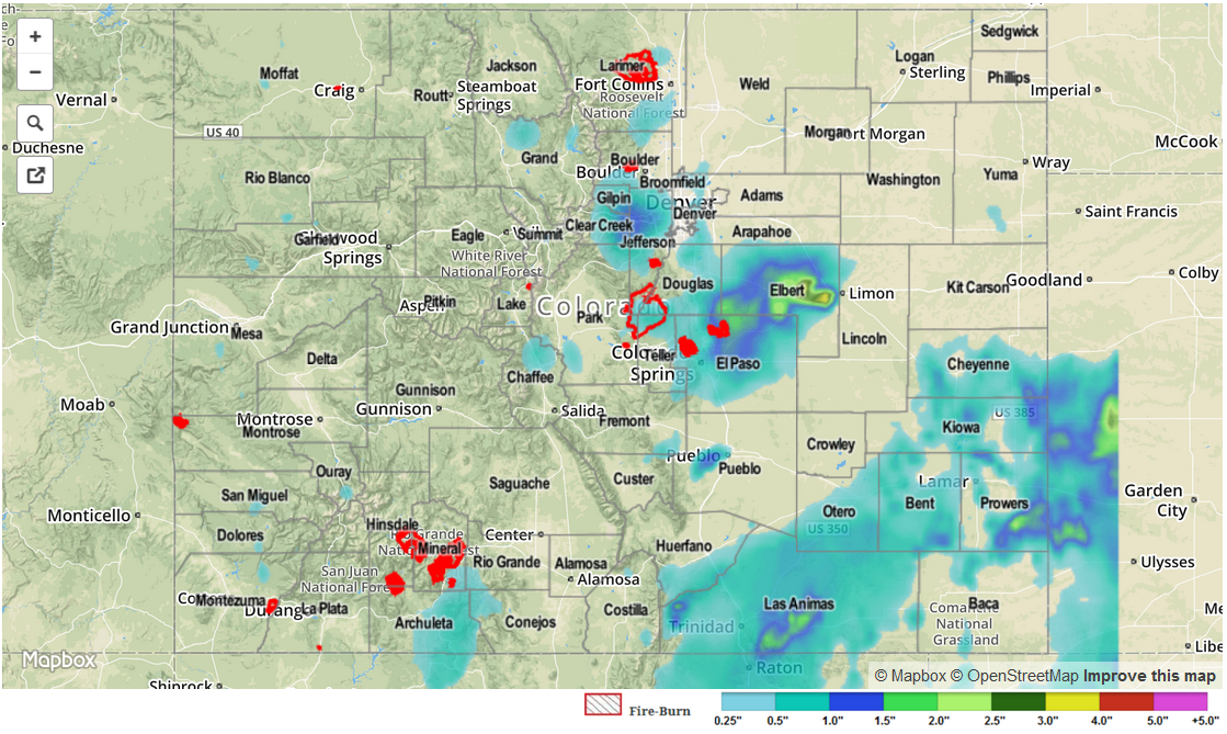 Back to yesterday’s weather, many locations across the state received over an inch of rain. As noted by CoCoRaHS observers, the following counties experienced 1 inch or more rainfall: Garfield, El Paso, Weld, Adams, Denver, Routt, Eagle, Cheyenne and Fremont. However, hourly rain amounts were in the 0.2-0.5 inch intensity, preventing any flood threat. Nonetheless, many urban areas saw minor ponding of water in the streets.