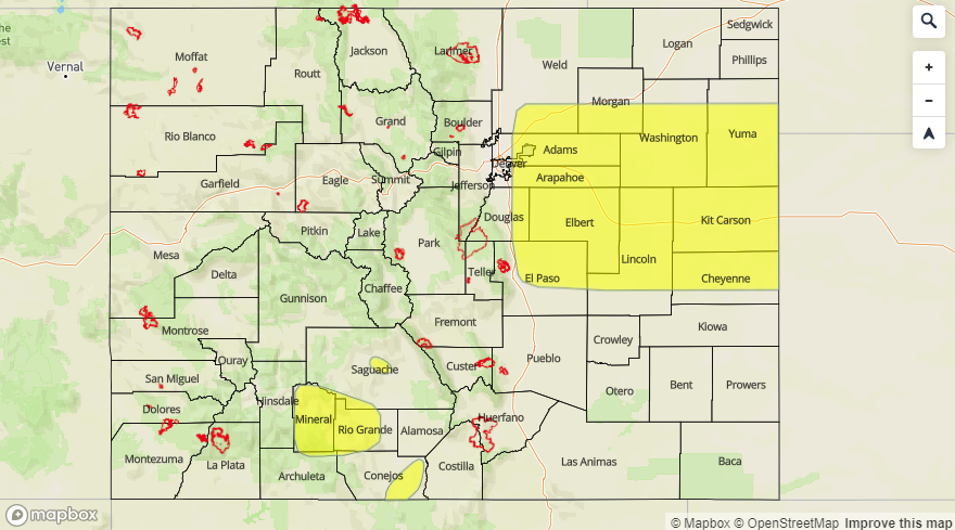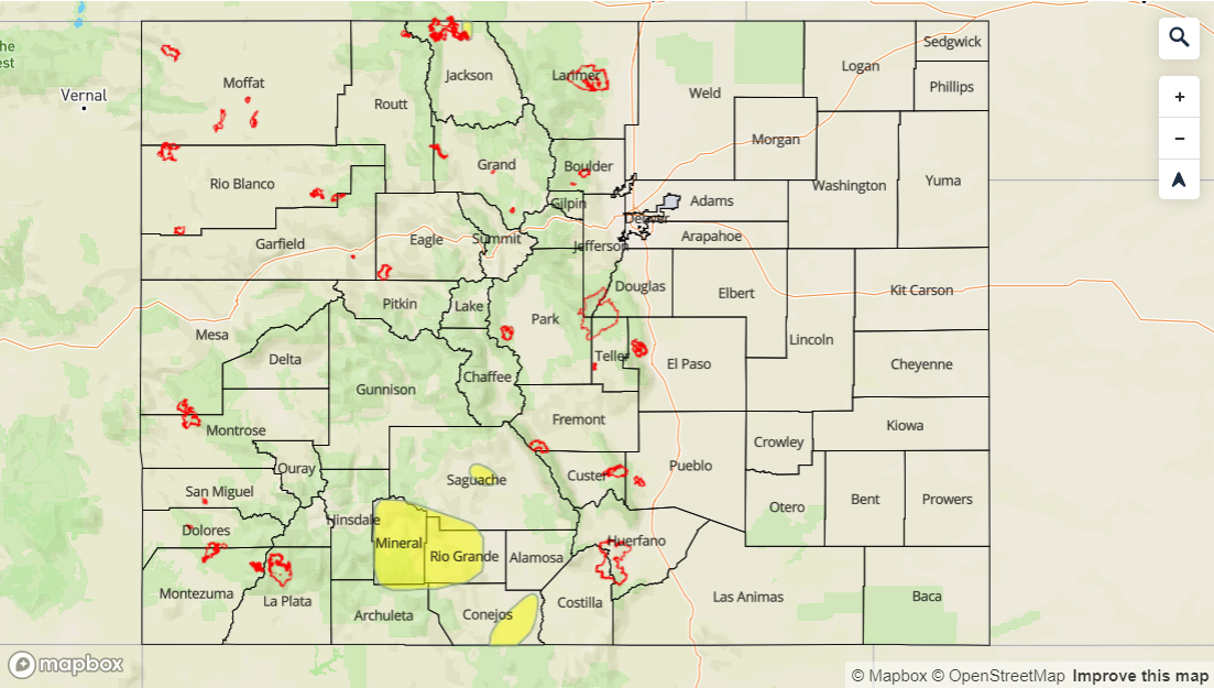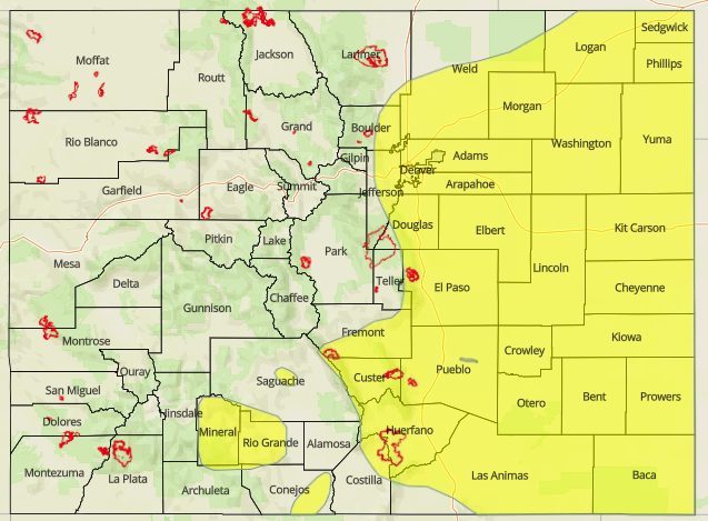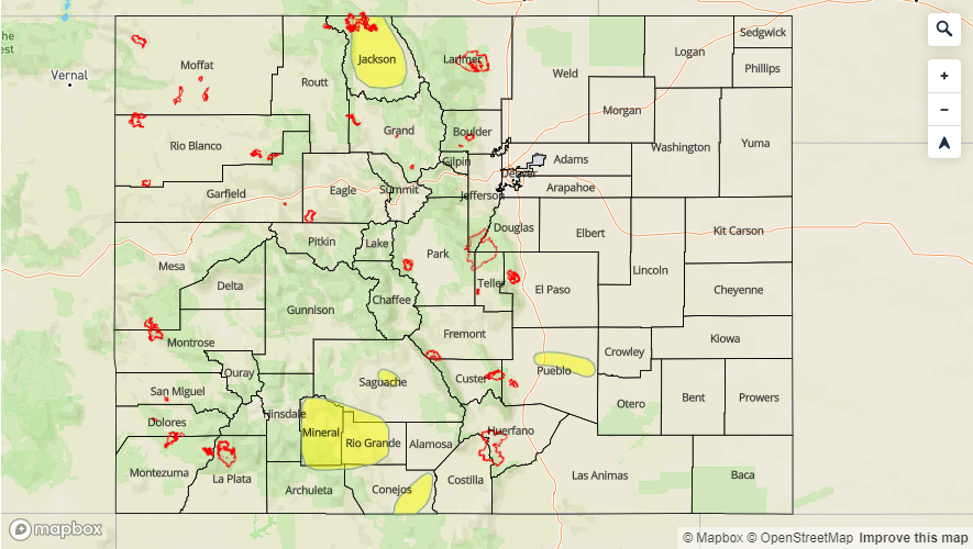 The riverine Low flood threat continues for various stretches of river across the state and are marked in the flood threat map below. Saguache Creek, the headwaters of the and along the Rio Grande in Mineral and west Rio Grande Counties and the San Antonio/Conejos Rivers in south central Colorado have a Flood Warning issued through this afternoon. Minor flooding has also been reported, with some rural roads being washed out, in central Jackson County due to snowmelt and heavy rainfall the last couple of days. This Flood Warning continues through 1PM this afternoon with river levels expected to decrease over the next day or two. Lastly, a Low flood threat has been issued for the Arkansas downstream of Pueblo Dam to Nepesta. The AHPS gage in Avondale is in the Minor flooding stage and is expected to remain elevated (at the current level) through today. For the most current updates and the latest information, follow your local NWS WFO (Weather Forecast Office).