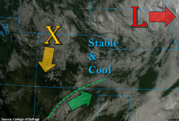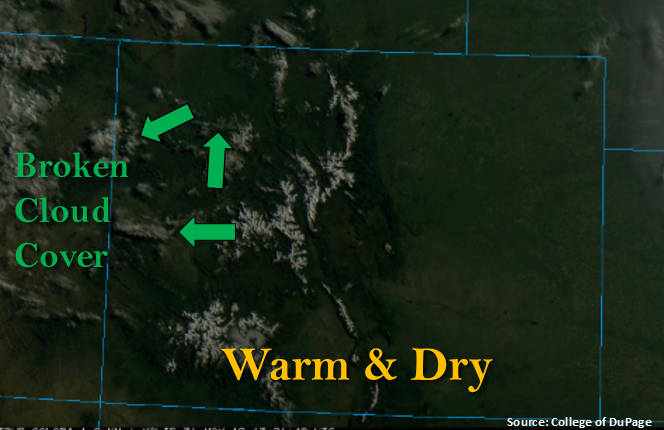 Minus some isolated, broken cloud cover over the Grand Valley and Northwest Slope (green arrows), this morning is off to a clear start. Temperatures are forecast to increase a couple more degrees today, which will feel quite pleasant to round out a chilly May. The ridge builds back to the northwest throughout the day with westerly flow aloft, similar to yesterday. Reduced low-level moisture and downsloping flow over the southern portion of the state should keep this area rain free. So while some afternoon cloud cover is likely over the San Juan, Southeast Mountains and immediate, adjacent Southeast Plains, only expect trace amounts of precipitation at the most. Upslope flow is expected to trigger isolated showers and possibly a weak thunderstorm or two over the Northern Mountains, Front Range and northern Central Mountains this afternoon. A few weak thunderstorms are also possible over the Palmer Ridge with northeast surface flow. Activity will likely spread into the Urban Corridor and Northeast Plains, but high-bases should limit rainfall. A couple weak thunderstorms are possible with lightning and gusty winds being the main threats. Flooding is not forecast.