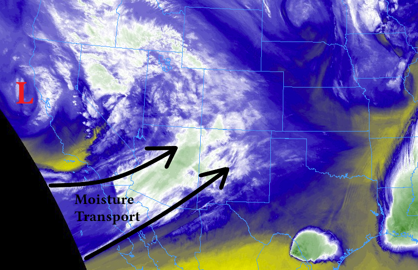 The next upper-level low will approach from the west today, becoming centered over Nevada by midnight tonight. Associated with this upper-level low is an area of broad moisture transport, highlighted in the image below, which will spread mid-level moisture across the state throughout this forecast period. For much of the day today, this southwesterly flow and ribbon of moisture will bring showers and a few thunderstorms to the High Country, spilling over into the valleys as they move towards the northeast. While the best coverage and strongest activity (relatively speaking) is expected during the afternoon and evening, this shower activity will continue overnight and into tomorrow morning.