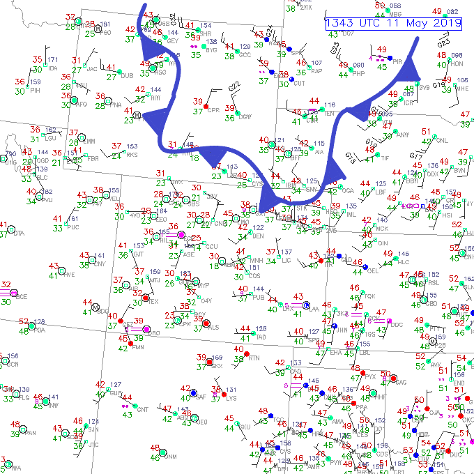 A surface cool front, driven by a disturbance aloft, will shift southward across eastern Colorado today. This front won’t bring a noticeable dip in temperatures, since our temperatures have been cool the last few days. Instead, this front will make its mark by providing gusty northerly winds and sparking isolated-to-scattered thunderstorms along and east of the Continental Divide as it moves southward across the region. A few thunderstorms will be on the strong side of the scale, producing brief periods of moderate-to-heavy rainfall, strong winds, and hail up to 0.5 inches in diameter. Otherwise, temperatures will be a few degrees warmer than yesterday, with plenty of sunshine before and after any showers/storms move overhead.