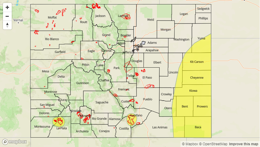 Showers and thunderstorms are likely this afternoon with the heavier totals expected over the eastern plains. Over the higher terrains, storms are expected to be more widespread over the Palmer Ridge/Southern Front Range intersect and the Southeast Mountains with isolated coverage further north. Max 1-hour rain rates up to 0.75 inches (west) and 1.8 inches (east) are possible. A Low flood threat has been issued for the Spring Creek burn area as well as for the far eastern plains. Threats over the burn scar include localized stream flooding, mud flows and debris slides. Over the eastern plains, localized stream and arroyo flooding is possible along with field ponding and flooding of low-lying roads. Storms should end around midnight over the higher terrains with storms ending a couple hours later over the eastern plains.