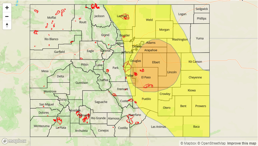 Threats with the thunderstorms today include heavy rainfall, large hail and strong winds. Storm motion will be to the ESE at 20-25 mph, so widespread flooding is not anticipated. However, multiple storms over one area may be possible, which would increase the 24-hour totals and runoff in the area. Street flooding, field ponding and local stream flooding are all possible. A Moderate flood threat has been issued for the Palmer Ridge, southern Urban Corridor and Southern Front Range. A Low flood threat has been issued for the Front Range, Urban Corridor, Northeast Plains and Southeast Plains.