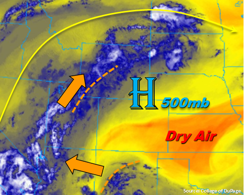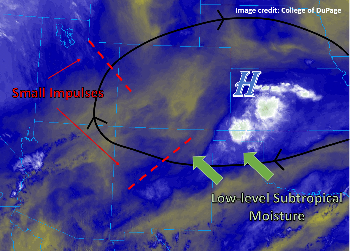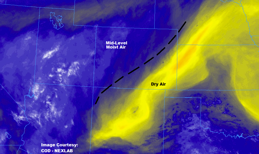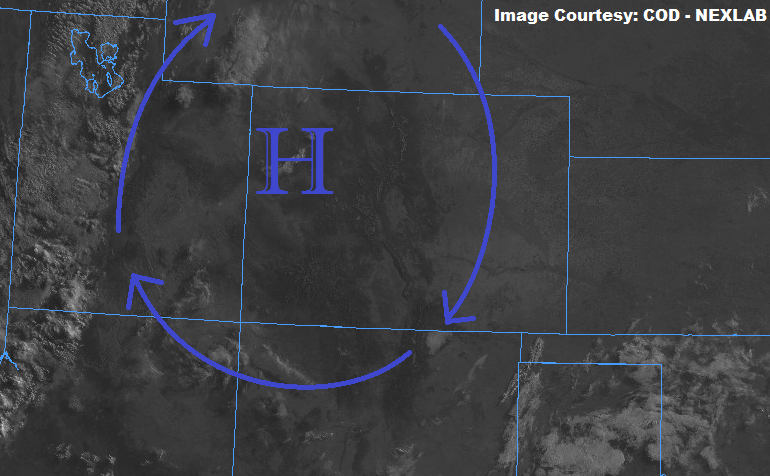 The center of 500mb ridge is currently over the Nebraska, Colorado and Wyoming intersect. The subtropical moisture on its west side has shifted westward out of Colorado as seen in the water vapor imagery below. Drier air has worked its way in on the east side of the high and the Precipitable Water measurement at Denver this morning was 0.74 inches. Flow aloft will be from the east over eastern Colorado, so this should keep the dry air in place and downward motion should nix thunderstorm activity over the lower elevations. Any clouds or isolated storms that form this afternoon will be over the mountains due to the eastward motion aloft.
