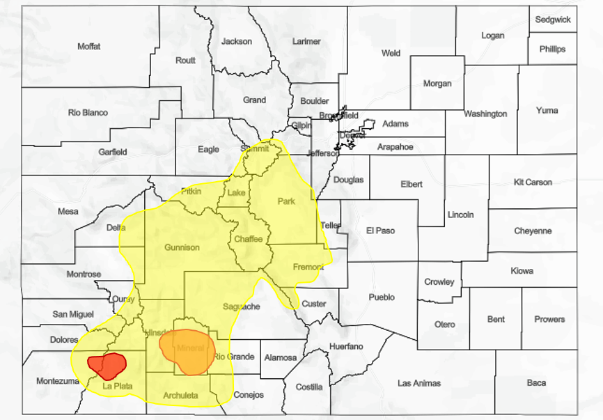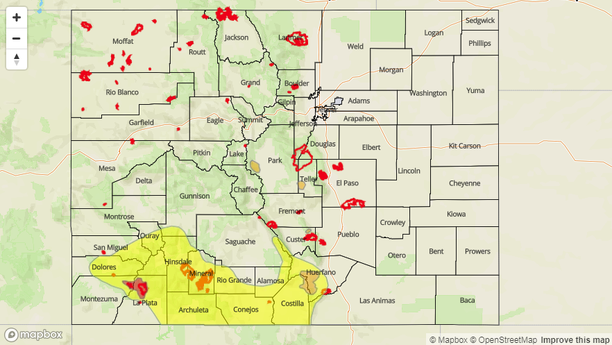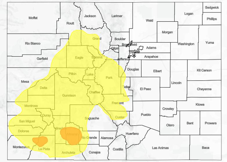 A couple disturbances may move into the northwest and southwest corners of the state as they propagate around the high pressure this afternoon. If this occurs, this would enhance the chance for showers and thunderstorms over the northwest corner of the state. Rain rates would be under 0.1 inches/hour for these storms. The best chance for thunderstorms this afternoon is again over the San Juan Mountains. Rain rates of these storms are forecast to be up to 0.5 inches/hour (less intense than the previous few days), but if they were to move over a burn area, flash flooding could occur. The main threats would be mud flows, debris slides and local stream flooding. A Low flood threat has been issued for the 416 and Burro burn scars. Elsewhere, flooding is not expected.