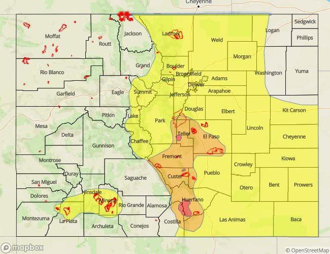 A HIGH FLOOD THREAT IS FORECAST TODAY FOR PORTIONS OF THE FRONT RANGE AND SOUTHEAST MOUNTAINS, NAMELY FOR THE SPRING FIRE, CHATEAU FIRE, AND ADOBE FIRE BURN AREAS.