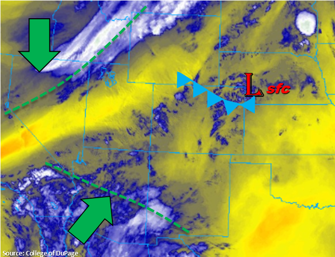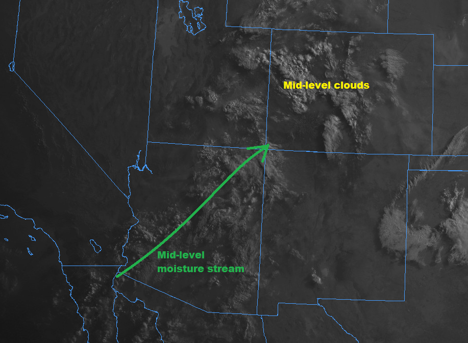 Everything is coming together for the cool and wet weekend. In the water vapor imagery below you can see the trough that will start to drop into Nevada/Northern California later today. You can also see the subtropical moisture from Bud starting to creep north over the southwest. But for today, that low level moisture won’t quite make it into western Colorado for the next round of afternoon thunderstorms and showers.