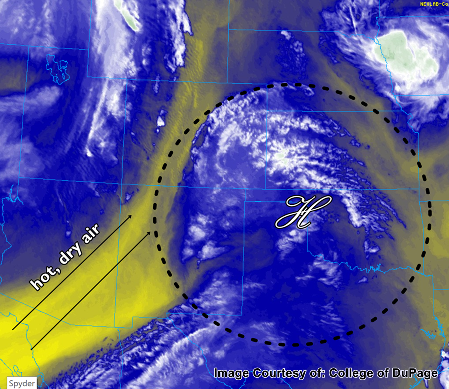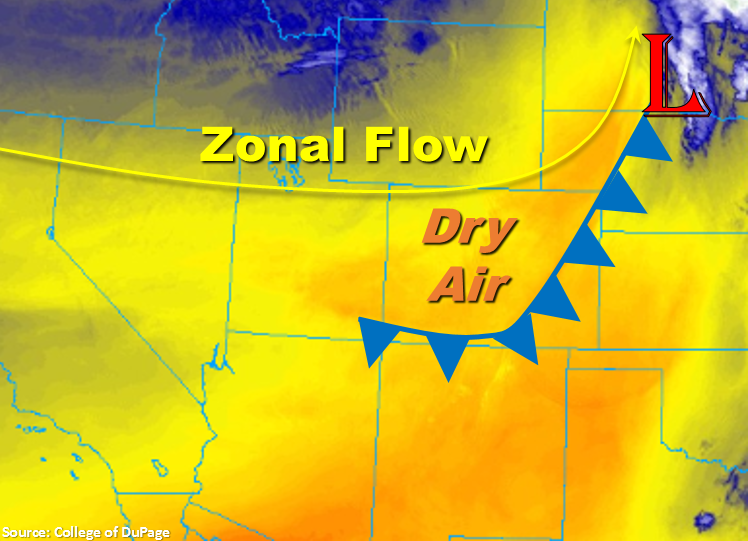 The water vapor satellite imagery below shows the current location of the cold front that came through last night. Unfortunately it is a dry cold front, so there was no precipitation associated with its passing. However with more northerly winds behind it, high temperatures will drop 5-10F today when compared to this weekend. Also decreasing today are the winds, as the trough associated with the gusty winds over the weekend will be passing to the north and east of Colorado. High winds speeds over the eastern plains are expected to decrease by early afternoon.