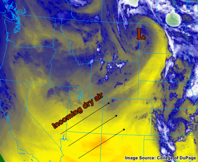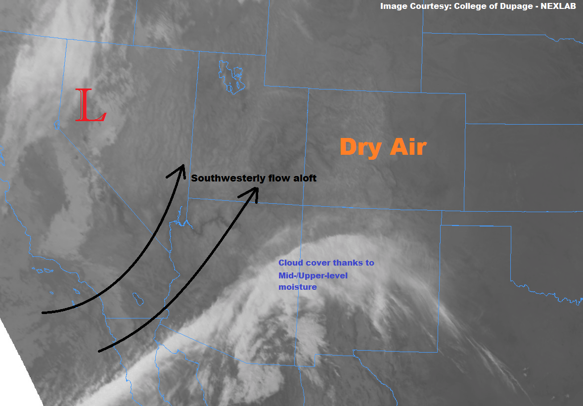 Hot and dry will be the name of the weather game today, with high temperatures reaching near-record levels across the Urban Corridor and Northeast Plains. High-based cumulus clouds will be the best Mother Nature can do with the only moisture existing 5km above the surface. An isolated, dry thunderstorm near the Cheyenne Ridge during the evening hours cannot be ruled out; if one does occur, it will produce gusty winds and lightning, and little (if any) rainfall. Some low clouds will be present during the morning hours tomorrow across the far eastern plains thanks to a surge of moisture from the Great Plains readying the atmosphere for thunderstorms tomorrow.