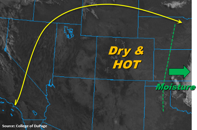 For areas east of the mountains, hot and dry conditions will be widespread, with temperatures taking aim at record highs across the Urban Corridor and Northeast Plains. The record high for the date in Denver is 95°F, to give you an idea as to the magnitude of heat expected. High-based cumulus clouds will be about all the atmosphere can muster, with a few streaks of virga being present beneath the cloud bases. An isolated dry thunderstorm near the Cheyenne Ridge cannot be ruled out, but will most likely occur on the Wyoming side of the border.