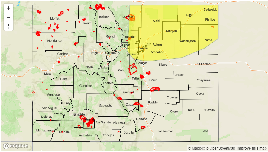 East of the Continental Divide, cooler and moist air remains after the passage of the frontal boundary. Upslope flow is expected to form this afternoon, favoring development of thunderstorms over the Front Range and Palmer Ridge. To the north, storms are expected to be more of a garden variety as they move into the Urban Corridor and Northeast Plains. Further south, more isolated, severe storms are expected to develop due to stronger daytime heating over the Palmer Ridge. The main threats will be large hail and gusty winds. Upslope flow continues into the evening and overnight creating more widespread but lighter showers over the eastern Southeast Plains and Raton Ridge. Flooding is not expected today.