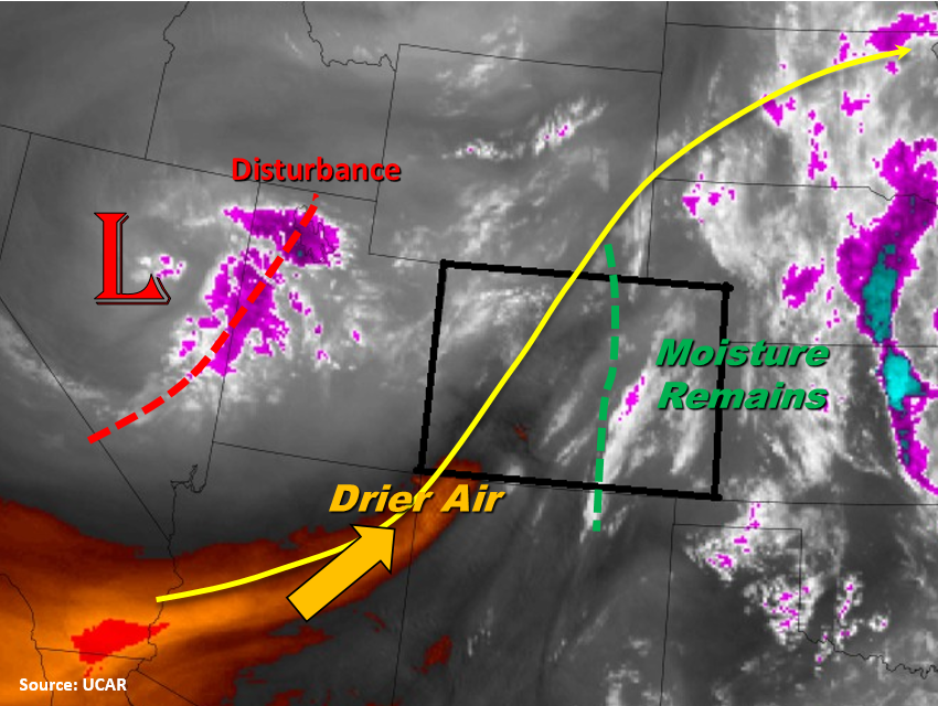 The low pressure system that has dominated Colorado’s weather pattern the last few days remains intact over Nevada. This disturbance will provide some upper-level support for thunderstorms in the form of minor shortwaves this afternoon. Southwest flow will continue, which will have various weather affects statewide. Over western Colorado, dry air will continue to be entrained from Arizona and New Mexico as indicated in the water vapor imagery below. The sounding at Grand Junction this morning indicates very little mid-level moisture, which will continue to mix out throughout the day. Thus (west), the isolated storms will be restricted to the Northern Mountains and Northwest Slope this afternoon with very limited rainfall.