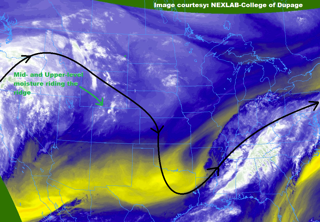 The high pressure ridge that we discussed yesterday continues to control the weather across Colorado, but it is beginning to have its authority challenged by an encroaching low-pressure system coming onshore the Pacific Northwest. From this low-pressure system is an ejecting, weak disturbance, accompanied by an increase in mid-/upper-level moisture (whites/greens in the water vapor image below). This disturbance will ripple through the high-pressure ridge today, providing support for isolated showers/thunderstorms this afternoon and evening. However, scant moisture in the low-levels will keep storms from producing much more than gusty winds, lightning, and plenty of virga, with only isolated areas of wetting rainfall. The best chance to see these wetting rains will be over the Front Range, Urban Corridor, Northeast Plains, Palmer, Ridge, and Southeast Plains, where low-level moisture will be best (relatively speaking).