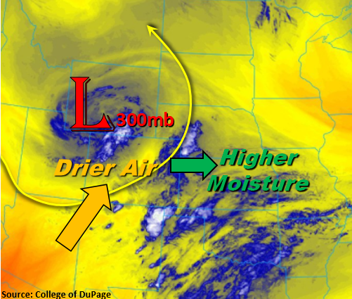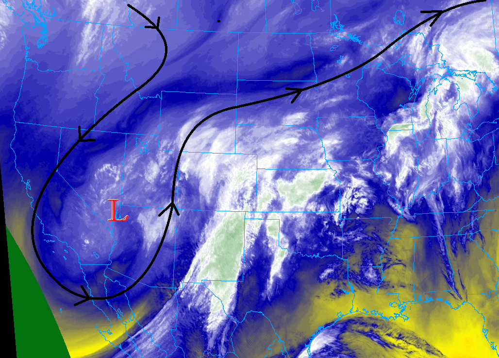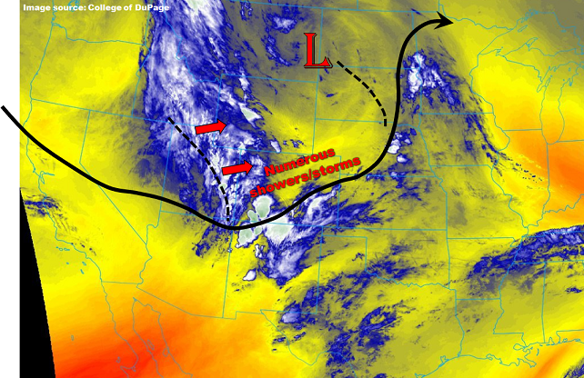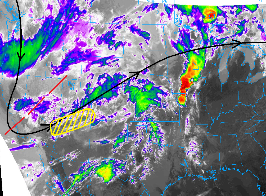The water vapor imagery below tells a large part of this period’s weather story. The upper-level low, highlighted by the red “L”, and associated trough will swing across the region today, bringing broad support for showers and thunderstorms nearly statewide. An attendant surface low-pressure center will also develop over the Southeast Plains, which will force upslope flow across the Northeast Plains, Urban Corridor, and into the Front Range – this is the one of the driving mechanisms behind today’s low flood threat.
