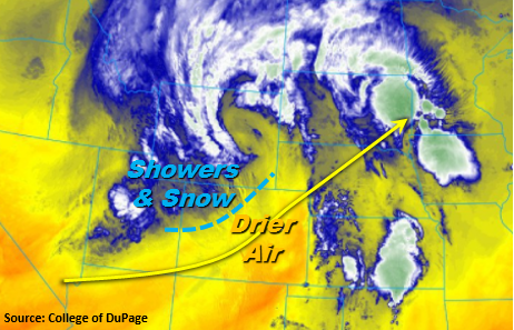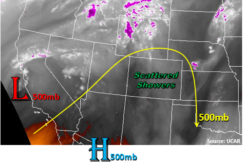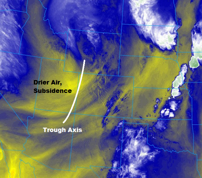 TThe upper-level low that has been responsible for the unsettled weather the past few days will finally get out of the area today, as the trough axis swings across the state. The current position of the axis is denoted on the water vapor image below, with drier, subsident air following behind. Ahead of the axis, more showers, and perhaps a thunderstorm or two, will kick off today, producing mainly light precipitation and gusty winds. The depth of the moisture isn’t sufficient enough to produce much more than that. A few isolated showers/weak thunderstorms will continue into the nighttime hours along/east of the Front Range as weak upslope flow and lingering moisture remain across the region.
