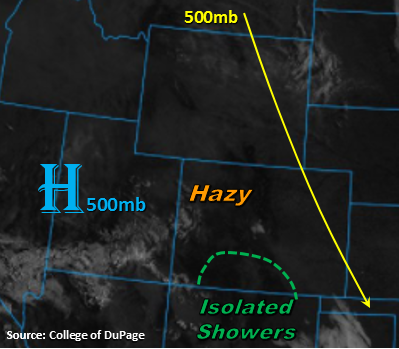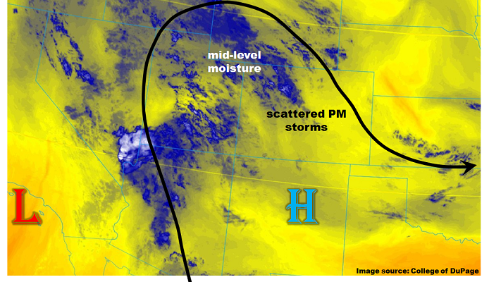 An upper-level disturbance, one that will likely affect Colorado’s weather on and off for the next 5-7 days, has made it to the southwest US coast. As shown in the water vapor image, below, southerly flow ahead of the disturbance is pushing monsoon-origin moisture northward into AZ/NV/UT. However, a weak ridge of high pressure is centered over western Colorado, implying that the brunt of this moisture will not make it into our state today. Instead, plenty of mid-level moisture is noted across the Western Slope this morning. Precipitable Water (PW) values were 0.59 and 0.75 inches at Denver and Grand Junction from the morning balloon launches. PW is not expected to change much, meaning that moisture levels will not be high enough for heavy rainfall today. With abundant sunshine this morning, expect scattered to numerous showers and thunderstorms across most of the High Country this afternoon and evening. Some storms are expected to make it farther east especially over the Cheyenne and Palmer ridges. However, rain rates will stay in the light to moderate intensity and flooding is not expected today.