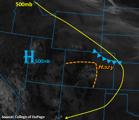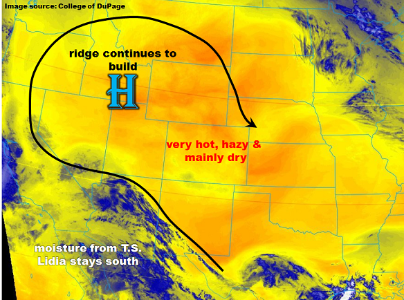 A few high clouds are present this morning over the Front Range and Central Mountains. Smoke from the wildfires in Idaho and Montana continue to limit visibility over the northern portion of the state and eastern plains as seen in the visible satellite image below. Visibility will be reduced to 2 to 4 mile range in the heaviest smoke over the eastern plains. The high pressure continues to sit west of the state, but a cold front is expected to drop south over the eastern plains late this afternoon and push through the rest of the plains overnight. As the front moves south, this may give some relief to northeast portion of the state from the hazy skies and warm temperatures. West of the Continental Divide, the ridging pattern will continue to encourage high temperatures and entrain smoke into the northern portion of the state.