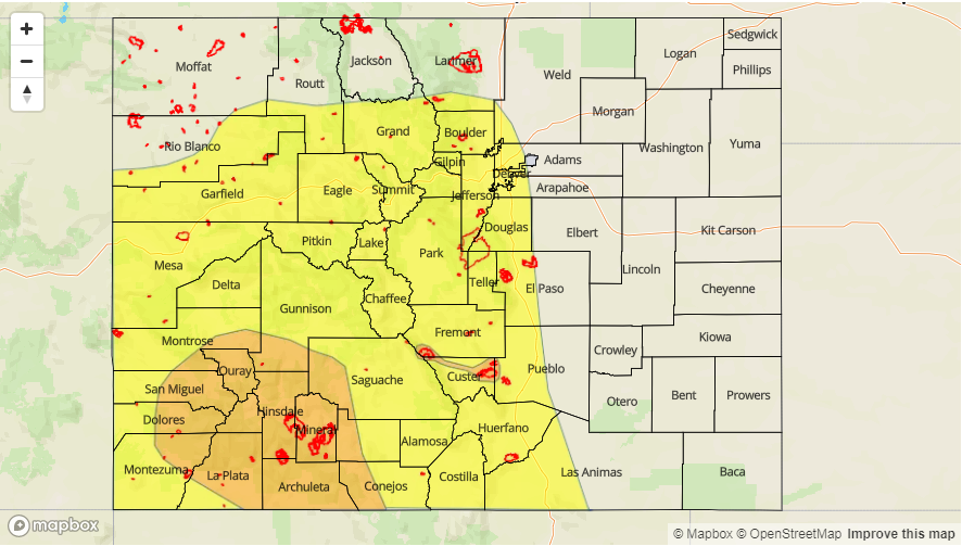 Sunny this morning becoming partly cloudy this afternoon. Storms are expected to be most numerous over the northern mountains and southern SE Mountains. Threats include small stream and road flooding as well as field ponding. Gusty winds and hail up to 0.75 inches are possible with stronger thunderstorms. Burn scars need to continue to be monitored closely. Storms over the SE Plains are expected to continue into the overnight hours with localized storm totals greater than 2.5 inches. 1-hour rain rates will be up to 1.7 inches (east) and 0.7 inches (west). A Low flood threat has been issued.
