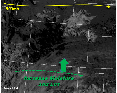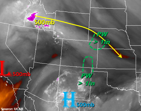 The state will be under light W/NW flow under the upper-level ridge today, which center has shifted a bit to the west. As seen on the water vapor image below, this will advect drier air into the mid-levels. This is expected to mix out moisture at the surface over the entire state excluding the northeast corner of the state and the Raton Ridge/western Southeast Plains. Precipitable Water (PW) is currently at 0.87 inches in Grand Junction and 0.7 inches in Denver. Even with low-level moisture mixing out in these areas throughout the day, there will still be enough residual moisture for showers over the higher terrains and adjacent plains. However, most storms today are expected to produce more wind than heavy rainfall. A lee trough is expected to set itself up over the far eastern plains and with strong southerly surface winds east of it. This will advect more moisture northwards from NE New Mexico where Tds are currently in the mid to upper 60s. Where PW is forecasted to be greater than 1 inch this afternoon/evening is marked on the map below.