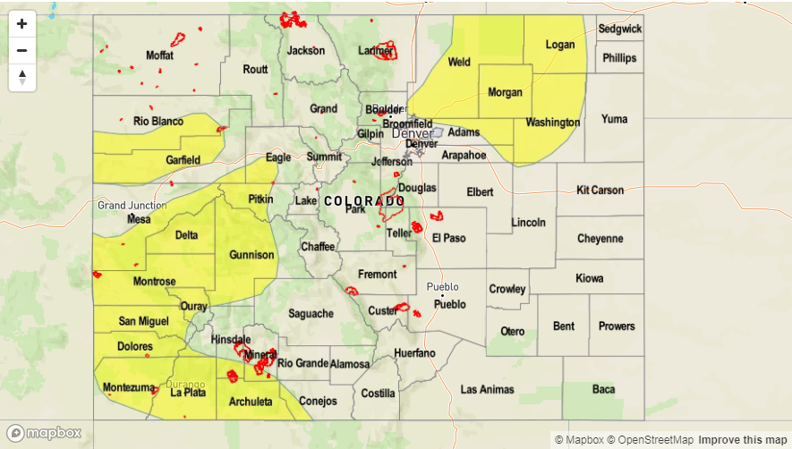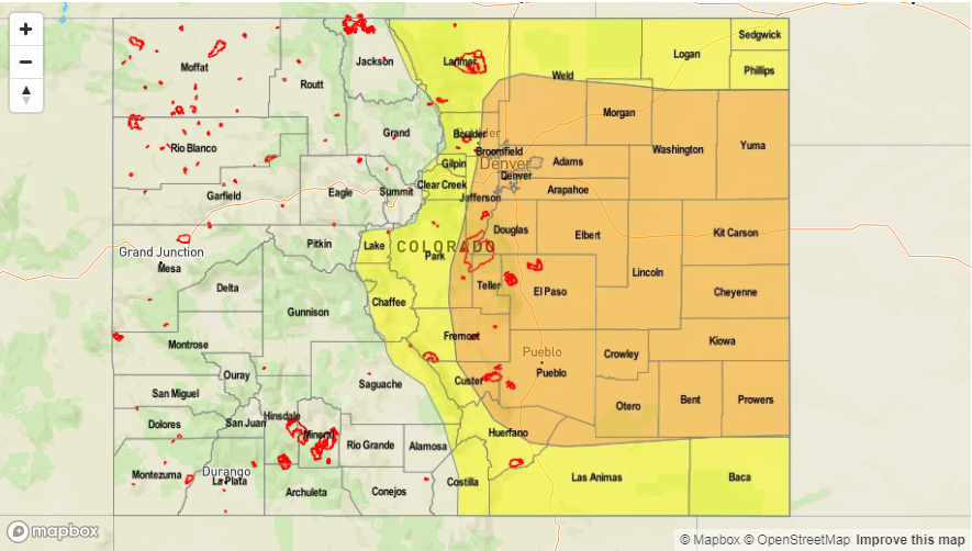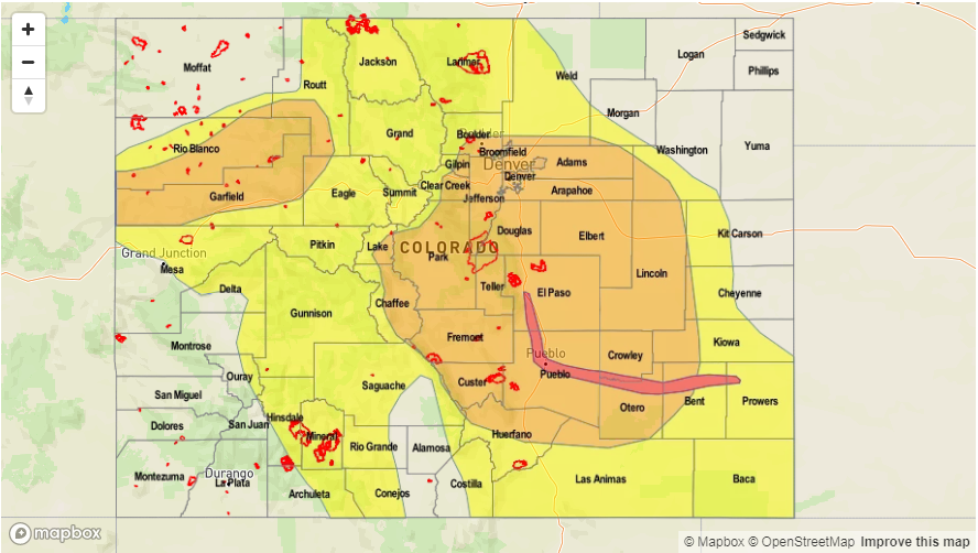 — LOW/MODERATE flood threat Northwest Slope, Northern Mountains, Grand Valley, Urban Corridor, Central Mountains, Front Range, Palmer Ridge, Southeast Plains, Southeast Mountains